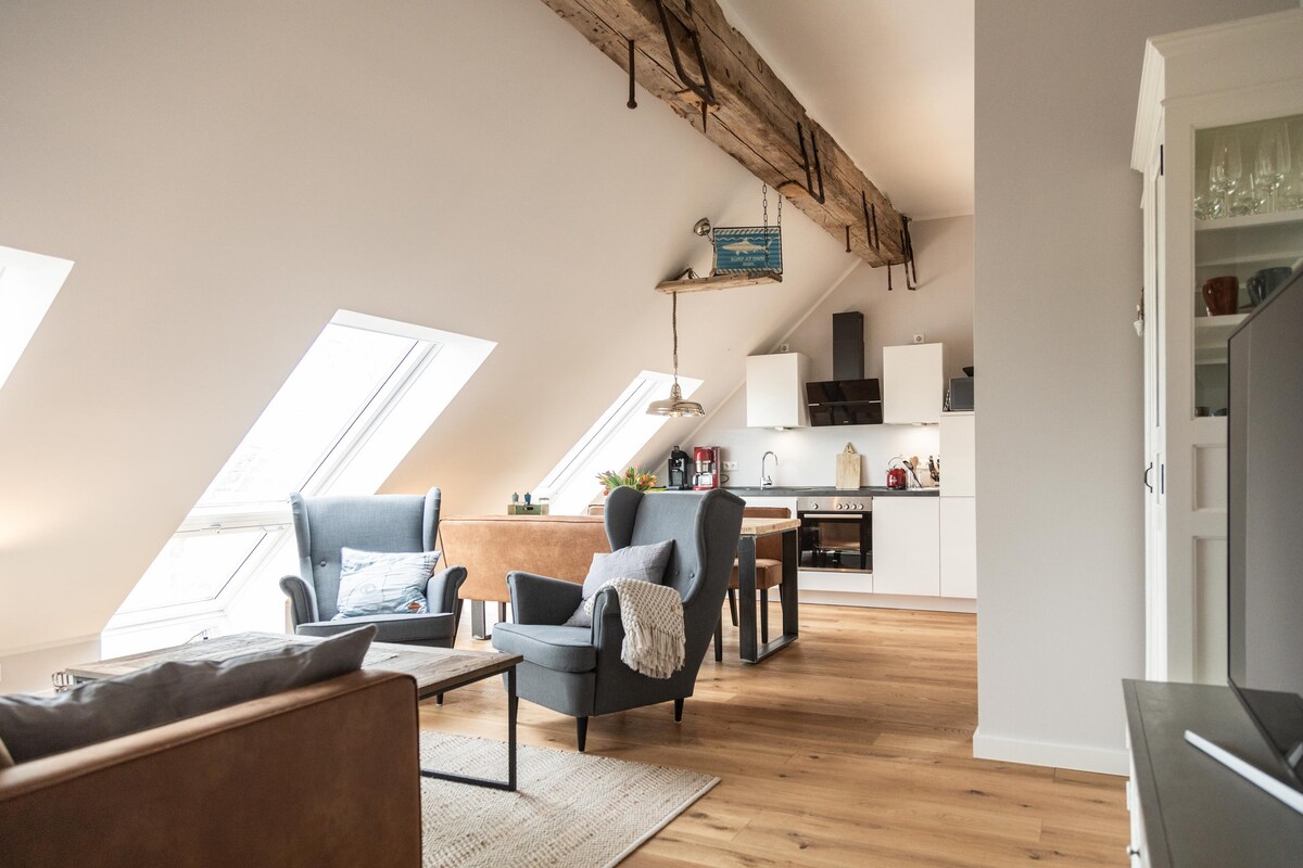 Nýuppgerð íbúð okkar með 1 herbergi er staðsett í hjarta miðbæjar Emden, með útsýni yfir Ratsdelft. Það er innréttað með ást á smáatriðum. Markmið okkar er að bjóða gestum upp á öll þau þægindi sem eru meiri en 30 mílur sem stuðla að ánægjulegri og afslappaðri dvöl. Íbúðin okkar er lítil en falleg og býður upp á eitthvað sérstakt í notalegu andrúmslofti.