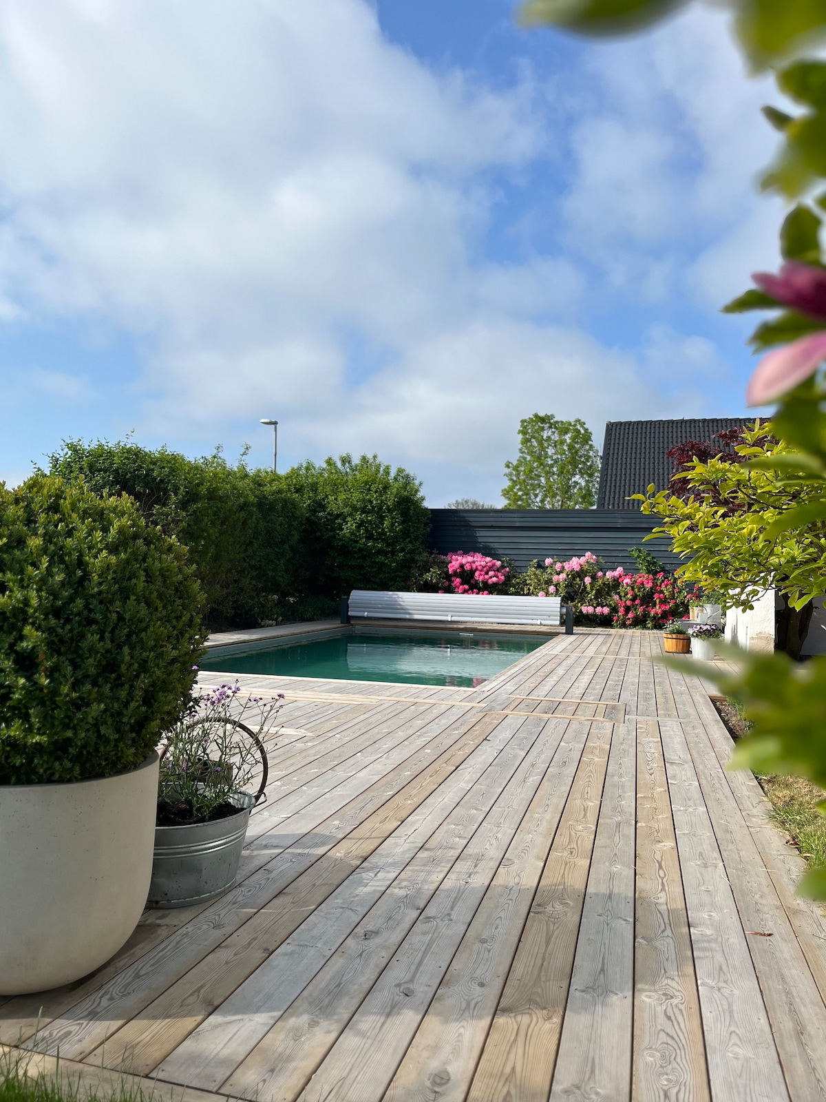 Njóttu þín í þessari yngri svítu með frábæru útsýni. 35 m2 með eigin sturtu/wc og einkabaðstofu. Eldhúskrókur með örbylgjuofni, litlum ísskáp, katli, brauðrist, eldavél, gosstreymi og loftsteikjara. Gestahúsið er staðsett við hliðina á okkar eigin heimili. Útivistarsvæðið er sameiginlegt. Nálægt Vasatorp GK og aðeins 15 mínútur til Helsingborg og Väla. Aðgangur að stórri laug, appelsínutrjágróðurhúsi, úteldhúsi og nuddpotti. Í húsi eiganda er aðgangur að þvottavél/þurrkara, ísskáp/frysti og litlu ræktarstöð. Hægt er að fá lánaðar reiðhjól. Hleðslutæki fyrir rafmagnsbíl í boði, 4 SEK/kWh.