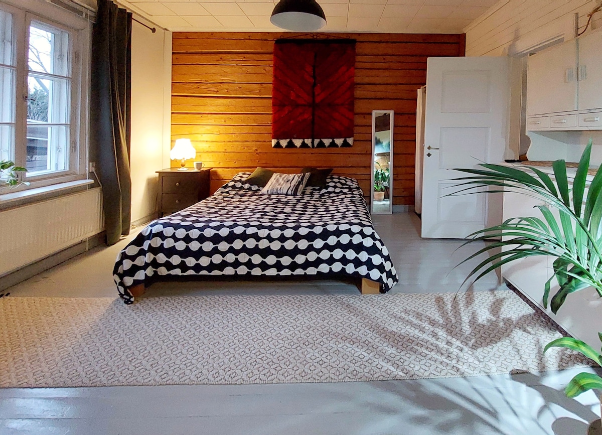 Bjart stúdíó með svölum og fallegu útsýni yfir vatnið. Það er ókeypis bílastæði nálægt íbúðinni. Loftgjafinn heldur íbúðinni kaldri jafnvel í sumarhitanum. Í íbúðinni eru rúm fyrir fjóra: hjónarúm (160 cm) og svefnsófi (160 cm). Innifalið í gistiaðstöðunni eru rúmföt og handklæði. Það er lyfta í húsinu. >> Miðbær Hämeenlinna 1 km >> Verkatehdas, theatre and Suisto club 200m >> Aulanko 4km >> Lestarstöð 800m >> Matvöruverslun 300m >> Hleðslustöð fyrir rafbíla 150m