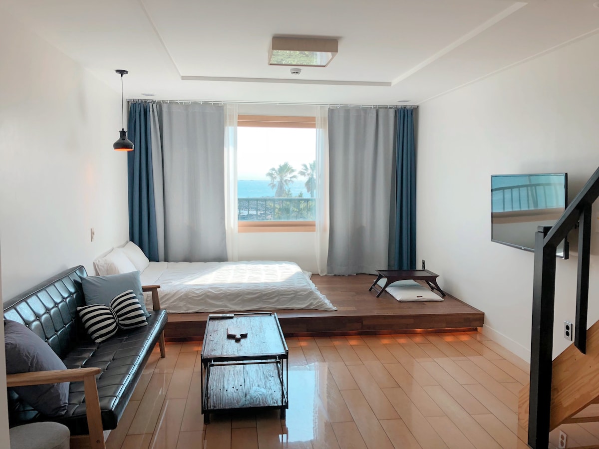 Hello. This is 'Badangkkot'. Located in Namwon-eup, which is known for its warmth and tangerines, and is one of the most famous areas in Jeju Island. You can take a stroll along the coastline on the Olle Trail No. 5 by foot. Nearby, there are convenience facilities such as supermarkets, convenience stores, and banks within a 3-minute walk, making it convenient for families and couples. You can enjoy the stunning ocean view and the sound of the waves from every room.