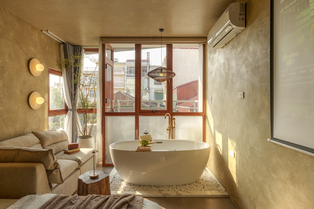Reinnovated 30yo house into a WABI-SABI Insta-worthy studio straight out of Pinterest📸 🚊SO CENTRAL!!! 2mins on foot to Food St, Train St, Imperial Citadel, etc. ✨5-star hotel-grade mattress, black out curtains, netflix, jacuzzi 🛀 🙋nice hosts who guide you thru every step of your stay-or stays invisible if you prefer-plus a local friend 4life 💻CAT6 cabling for business-grade Wi-Fi & steady LAN (💕 our diginomads) 🌿quiet neighborhood that makes you forget you’re right in the HEART of Hanoi