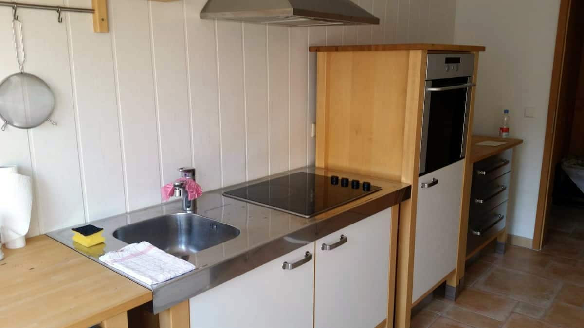 Íbúðin samanstendur af stofu, svefnherbergi, baðherbergi. Í svefnherberginu er tvíbreitt rúm og í stofunni er svefnsófi (1,20 m sólböð á breidd). Það er með hágæðainnréttingum og hannað með þægilegu korkgólfi. Á sumrin er hægt að nota garðinn, þar er bílastæði og geymsla fyrir hjól. Við búum í þorpi þar sem hægt er að komast að A2 með bíl á 15 mínútum.