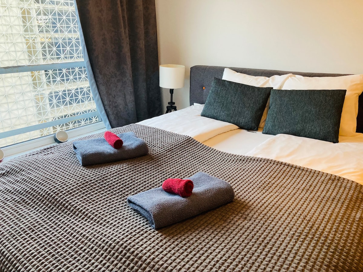 Íbúðin er staðsett í nýrri 20 hæða byggingu í Manhattan-stíl við miðbæjarmörkin. Íbúðin er þægileg með nútímalegum húsgögnum og stórum gluggum. Íbúðin er með ókeypis bílastæði á lokuðu bílastæði undir húsinu. Á jarðhæð hússins, á sjöttu hæð, er frjálslega nothæf þakverönd og grillaðstaða.