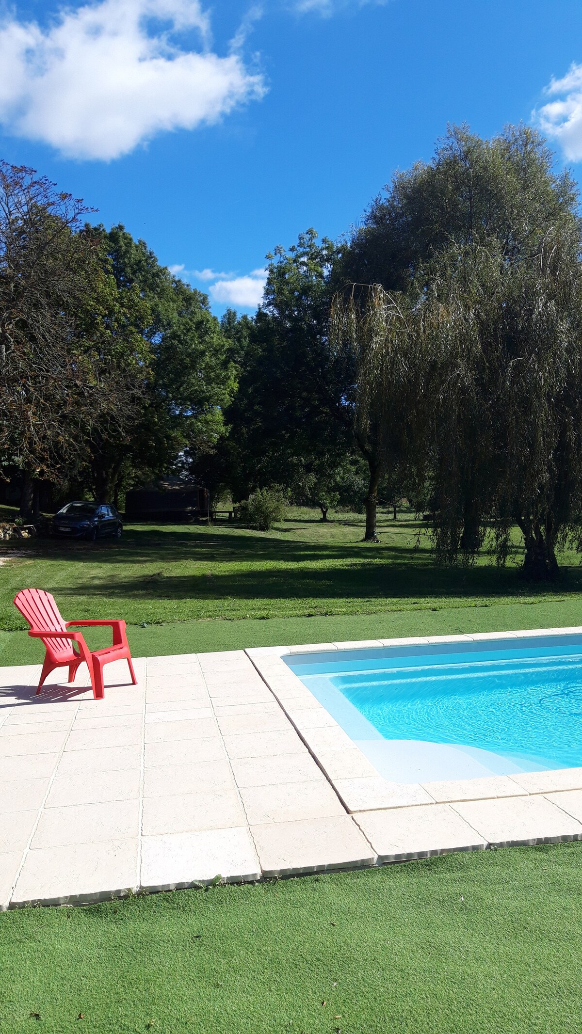 Langur steinsteyptur stígur í hjarta Gasconne-sveitarinnar er á milli akra og engja. Það er í lok þessa hvíta steinstígs sem lóðin okkar er staðsett og já "En Mayné" þýðir "Au domaine" í Gascon patois. Húsið samanstendur af gömlu steinhúsi og útihúsi sem er skipulagt sem risíbúð. Garðurinn hefur marga óvart í verslun fyrir þig, júrt ef þú ert að leita að zenitude, tjörn þar sem lítill bátur er að bíða eftir ferð og sundlaug til að slaka á.