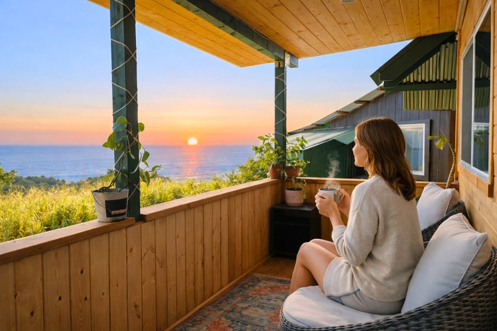 Bústaður með útsýni yfir hafið við sólarupprás nálægt Hilo og fossum