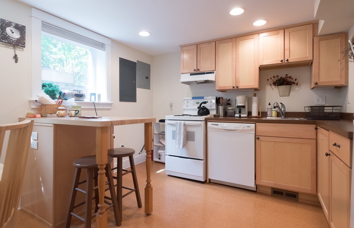 Óaðfinnanleg, heimilisleg, 1 herbergis íbúð með aðskilinni inngangi. Frábært fyrir foreldra sem heimsækja börn, viðskiptafólk og ferðamenn. Rúmgóð og björt með fullbúnu eldhúsi. Aðskilin beinir, svo hröð Wi-Fi-tenging. Margir gestir taka eftir: „Frábært þrýstingur í sturtu!“ Ef þú vilt fá þér lúr er svefnherbergið langt frá eldhúsinu. Nágrannar eru úti um daginn; rólegt á nóttunni. 5 mínútna göngufjarlægð frá vinsælum veitingastöðum og rútum í Division í miðbænum eða 15 mínútna göngufjarlægð frá Hawthorne í gegnum falleg hverfi Portland.