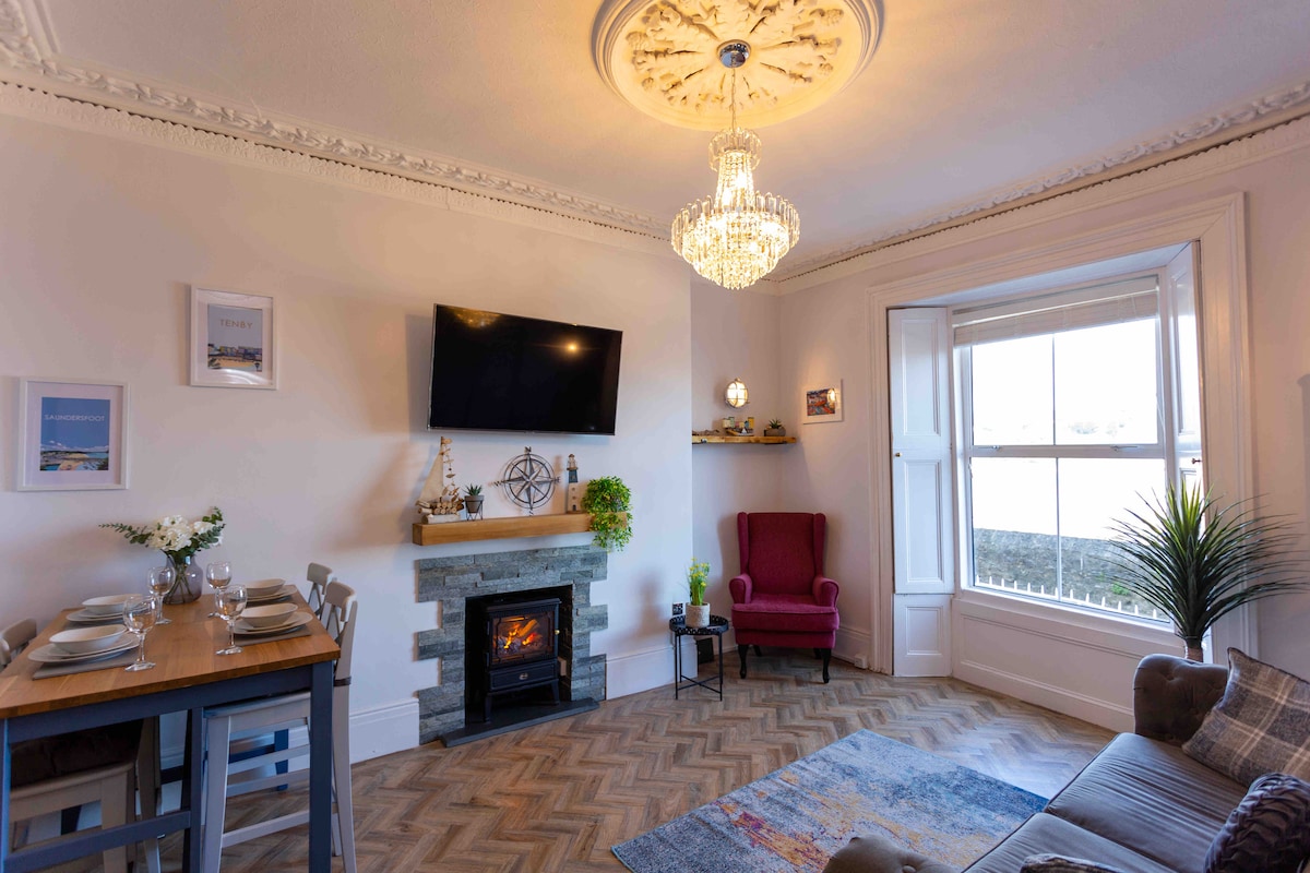 🏖 Þessi fallega eign á 1. hæð við ströndina er með útsýni yfir hina þekktu Tenby-höfn og North Beach. Slakaðu á og njóttu fallega útsýnisins frá þægindunum við stóra flóann. Náttúruleg ljós flæðir yfir stílhreina, opna stofu/borðstofu og fullbúið eldhús sem lætur þér líða eins og heima hjá þér. Stóra svefnherbergið með King Size rúmi og viftu í lofti er staðsett hljóðlega aftast í eigninni til að tryggja að þú fáir góðan nætursvefn. Einn vel liðinn hundur tekur vel á móti þér.