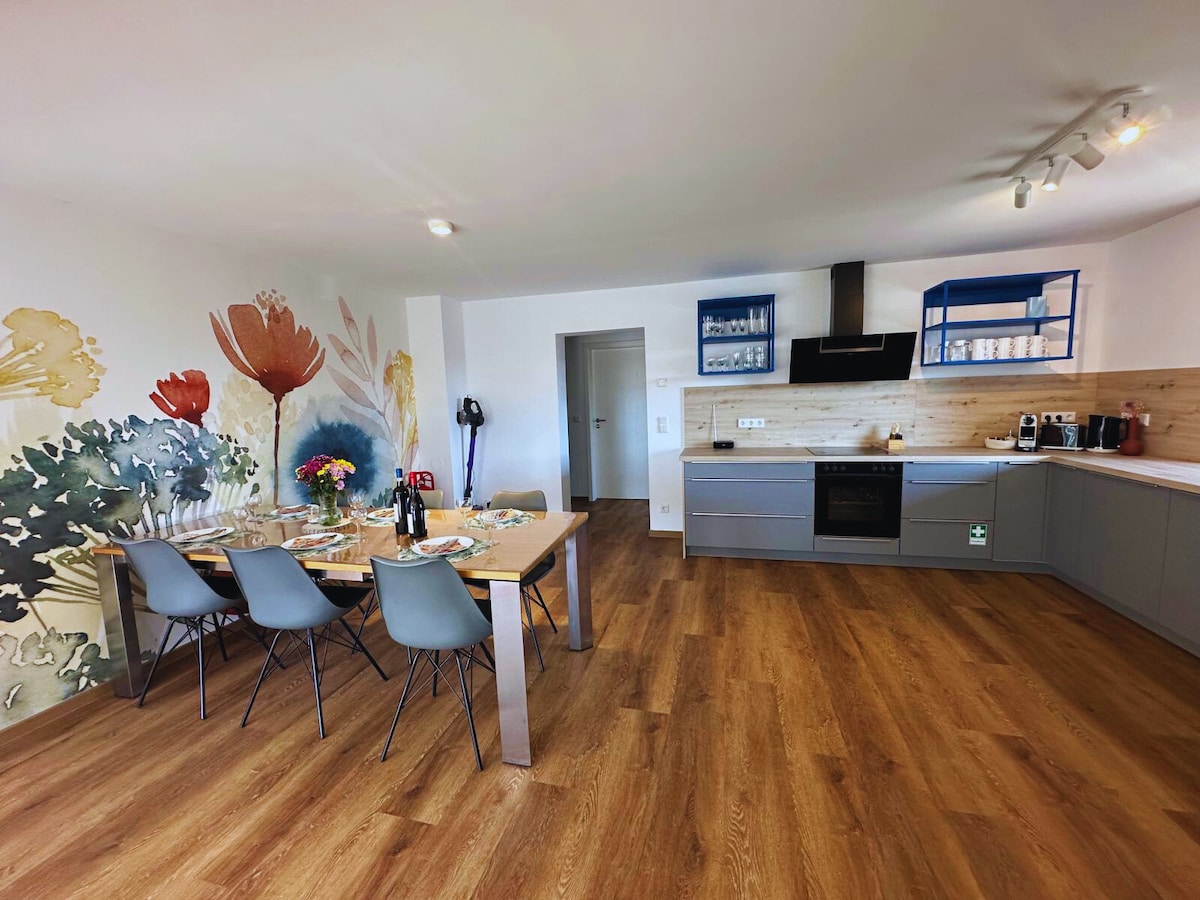 Rómantíska gallerí íbúð okkar er hluti af bænum okkar, sem er staðsett á friðsælum afskekktum stað (með nærliggjandi bæ við hliðina á því) aðeins 1,3 km frá norðurströnd Great Brombach Lake (Allmannsdorf). Íbúðin er með notalegan garð með valhnetutré, lystigarði og grillaðstöðu.