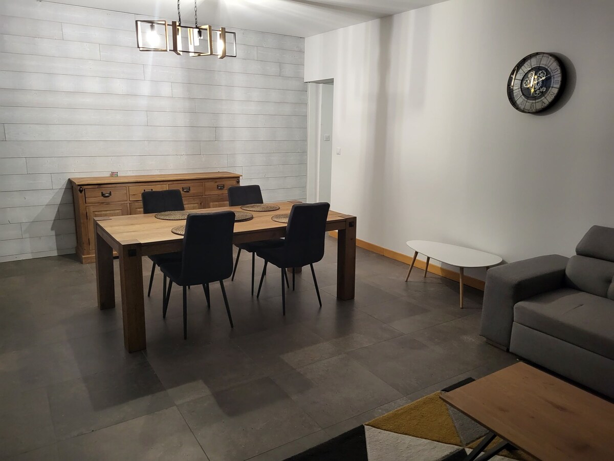 Hlýlegt hús í 500 m fjarlægð frá lestarstöðinni og nálægt hraðbrautarásunum. Hún samanstendur af notalegri stofu sem er opin með húsgögnum og útbúnu eldhúsi (eldavél, ofni, vélarhlíf, örbylgjuofni, ísskáp, frysti og litlum tækjum), svefnsófa fyrir 2, skrifstofuaðstöðu og borðstofu, fallegt svefnherbergi og baðherbergi með sturtu og þvottavél. Allt þetta er fullbúið með snjallsjónvarpi, þráðlausu neti og stórum geymsluskáp. rúmföt og handklæði fylgja.