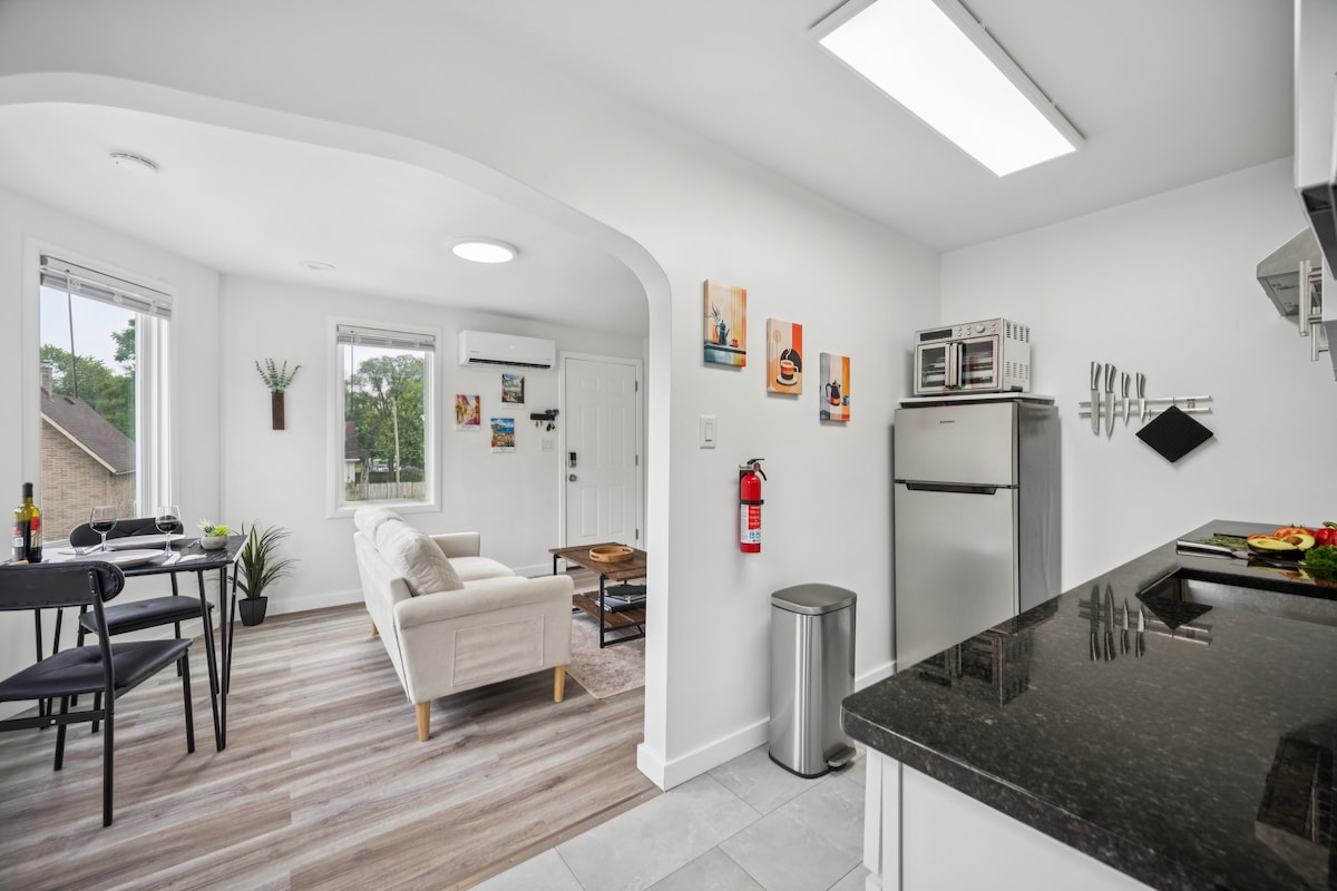Þú munt gista í efri hluta nútímaheimilis okkar í miðborg Corktown. Einingin er með einkaaðgang frá hliðarinngangi og 17' háum hvelfdum loftum með þakglugga sem sker sig í gegnum rýmið til að sýna sneið af himninum. Fullbúið eldhúsið okkar er fullt af nauðsynjum. Borðstofuborð rúmar vinnu eða máltíðir. Svefnherbergið er með glæsilegt útsýni yfir sögufræga Michigan Central Train Depot.