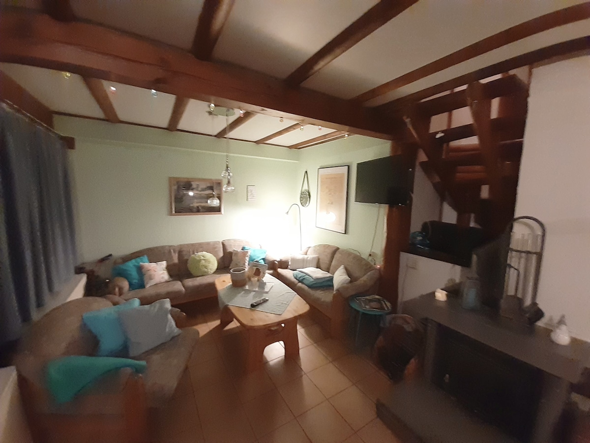 Heimsæktu okkur í nýuppgerðum bústaðnum okkar á landi sem er yfir 1000 m² með beint við hliðina á læk, yfirbyggðar svalir og stórt garðsvæði! The 50 fm tré hús er á rólegum stað í útjaðri þorpsins og var vaknað með mikilli ást á smáatriðum frá Sleeping Beauty sofa. Litla afdrepið okkar hefur verið endurnýjað og nýlega innréttað bæði að innan og utan. Taktu þér hlé og hlaða batteríin við arininn á notalegum kvöldum:-)