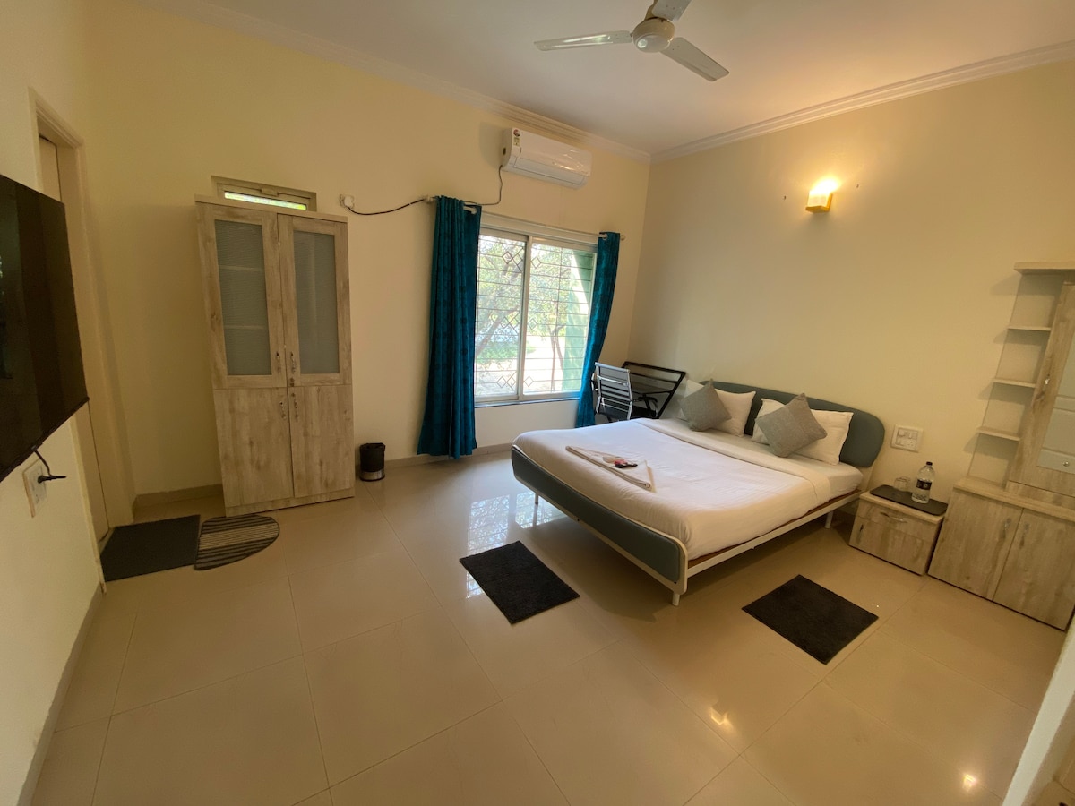 Stígðu inn í friðsældarheim þegar þú opnar dyrnar að „Andaðu.„ Þessi úthugsaða lúxusíbúð með einu svefnherbergi í 40 hektara golfi er griðastaður mitt í iðandi borgarlífinu og býður þér friðsælt athvarf til að slaka á, slaka á og hlaða batteríin. Staðsett nálægt Mumbai – Pune hraðbrautinni, gerir þessa eign fullkomna fyrir stutta heimsókn til Pune borgar eða bara fara í helgarferð. Íbúðin býður upp á yfirgripsmikið útsýni yfir golfvöllinn, ána og fjallgarðinn.