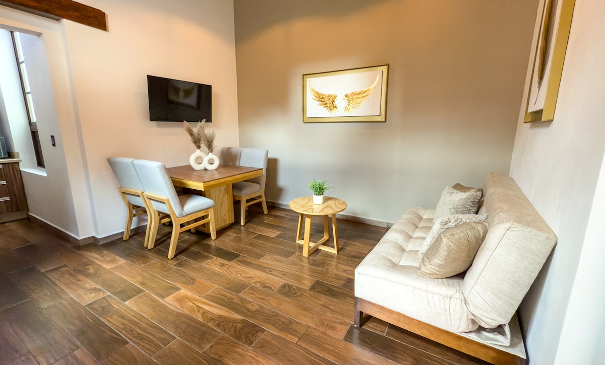 Þægileg íbúð með einstakri staðsetningu, mjög nálægt borginni Zócalo de la Ciudad sem er tilvalin fyrir pör, heimaskrifstofu og/eða hvíld. Þar er svefnherbergi með queen-size memory foam dýnu sem hentar þér; stofa, borðstofa, eldhús og fullbúið baðherbergi. Internet 80 Mb, 2 snjallsjónvarp, Netflix, ísskápur, örbylgjuofn, kaffivél, straujárn, þurrkari. Handklæðaþjónusta og allt sem þú þarft fyrir eldamennskuna. Þvottavél og þurrkari á sameiginlegu svæði.