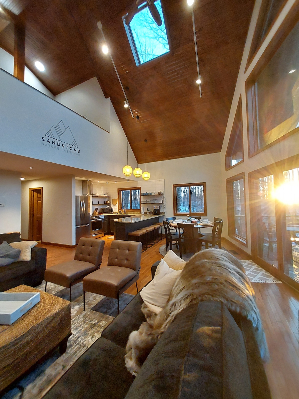 Sandstone is a luxury chalet perched atop 37 acres of private nature preserve, minutes from the area's favorite attractions, perfect for families and groups. - Sleep up to 12 - Private hiking trails on the property, just for you - Game room w/ pool table + video games and more - Amazing wraparound deck w/ hot tub and mountain views - Multiple smart TVs - Electric fireplace - Fully equipped + stocked kitchen - Outdoor dining area + fire pit No shortage of entertainment for everyone!