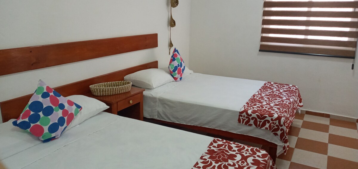 Departamento FAMILIAR de 96m2 Cuenta con cocina equipada, sala con desayunador, 2 recamaras (1 Queen 150x190 cms y 2 individuales 90x190) terrazas y 2 baños completos. Mini Splits, TV y Wifi. Ubicados a 30 metros del mar, cerca de varios Hoteles y clubs de playa. El conjunto cuenta con alberca y áreas para tomar el sol, así como area de lavandería (lavadora y secadora de monedas) A 10-15 mns (1km) aproximadamente del centro de Holbox y 800m de punta Cocos (Bioluminiscencia)