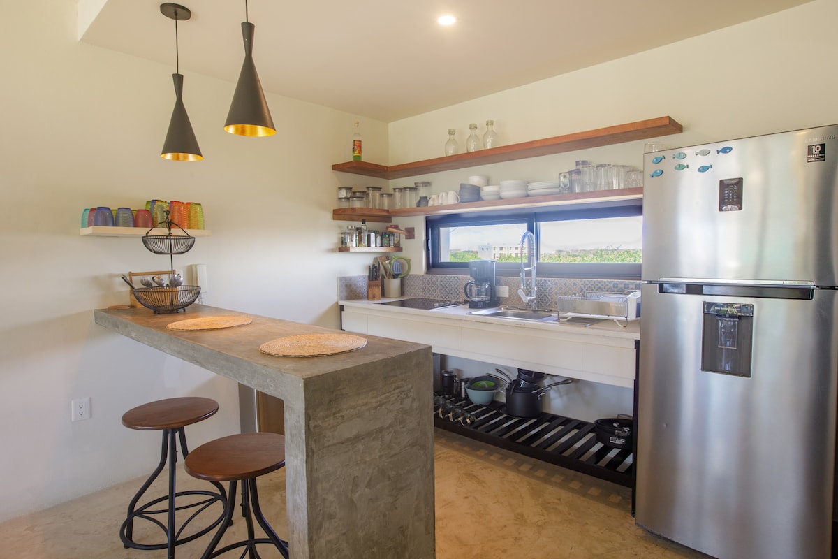 96m2 FJÖLSKYLDUÍBÚÐ Það er með fullbúið eldhús, bar, stofuna og morgunverðarsalinn, 2 svefnherbergi (1 Queen 150x190 cm og 2 einstaklingsverönd) og 2 fullbúin baðherbergi. Mini Splits, sjónvarp og þráðlaust net. Staðsett 30 metra frá sjó, nálægt nokkrum hótelum og strandklúbbum. Samstæðan er með sundlaug og sólbaðsaðstöðu ásamt þvottahúsi (myntþvottavél og þurrkari) 10-15 mns (1km) u.þ.b. frá miðbæ Holbox og 800 m frá Punta Cocos (Bioluminescence)