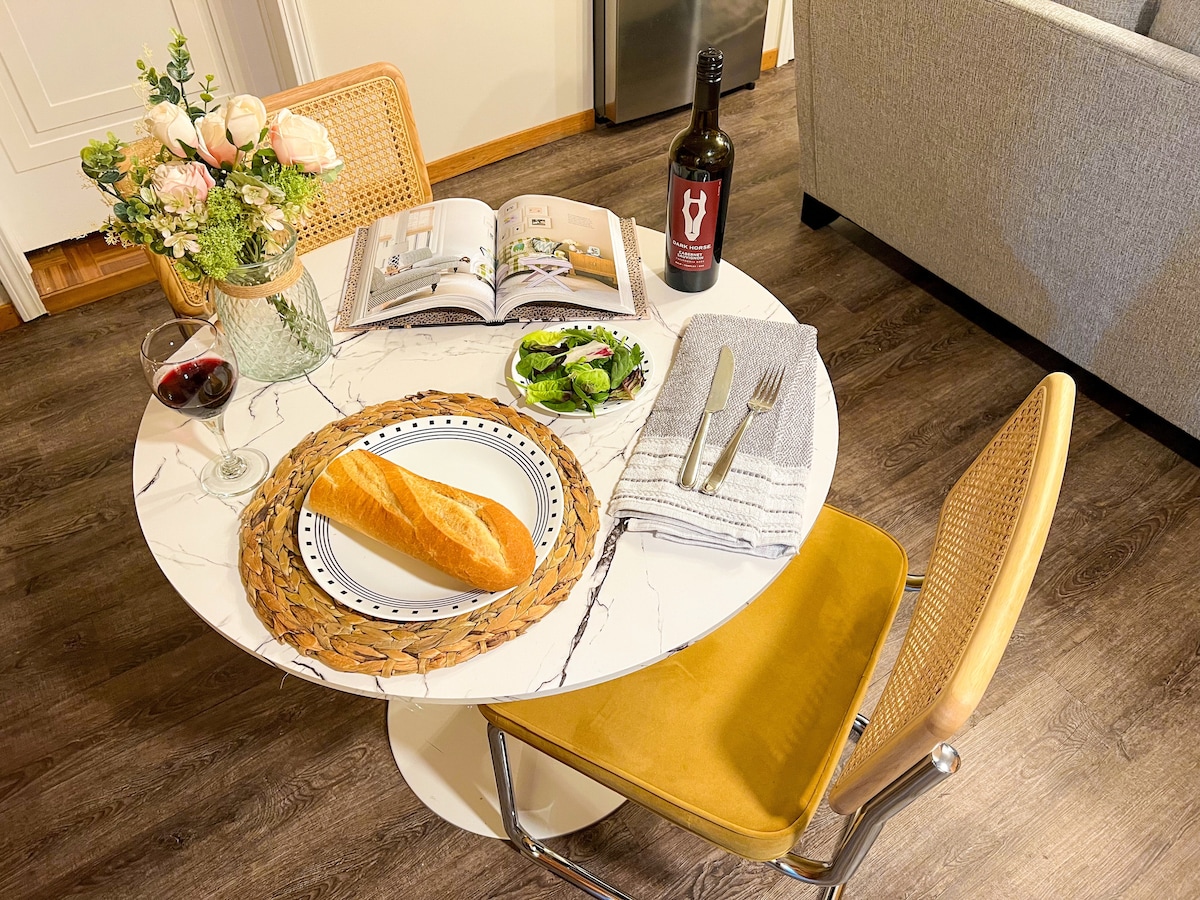 Göngufæri við veitingastaði, verslanir o.s.frv. Svítan á 1. hæð verður afslappandi afdrepið þitt. Rúm í king-stærð með 12 tommu frauðdýnu, dúnkodda/rúmteppi og myrkvunargluggatjöld gefa þér góðan svefn. BR er búið 2 hliðarborðum og tveimur borðlömpum sem hægt er að deyfa með 2 USB-tengjum. Bath býður upp á baðker, hégóma og opnar hillur. LR er með leðursófa, sófaborð m/lyftu og 70"straumspilunarsjónvarpi. LR opnar fyrir mat í eldhúsi með hefðbundnum matarbúnaði.