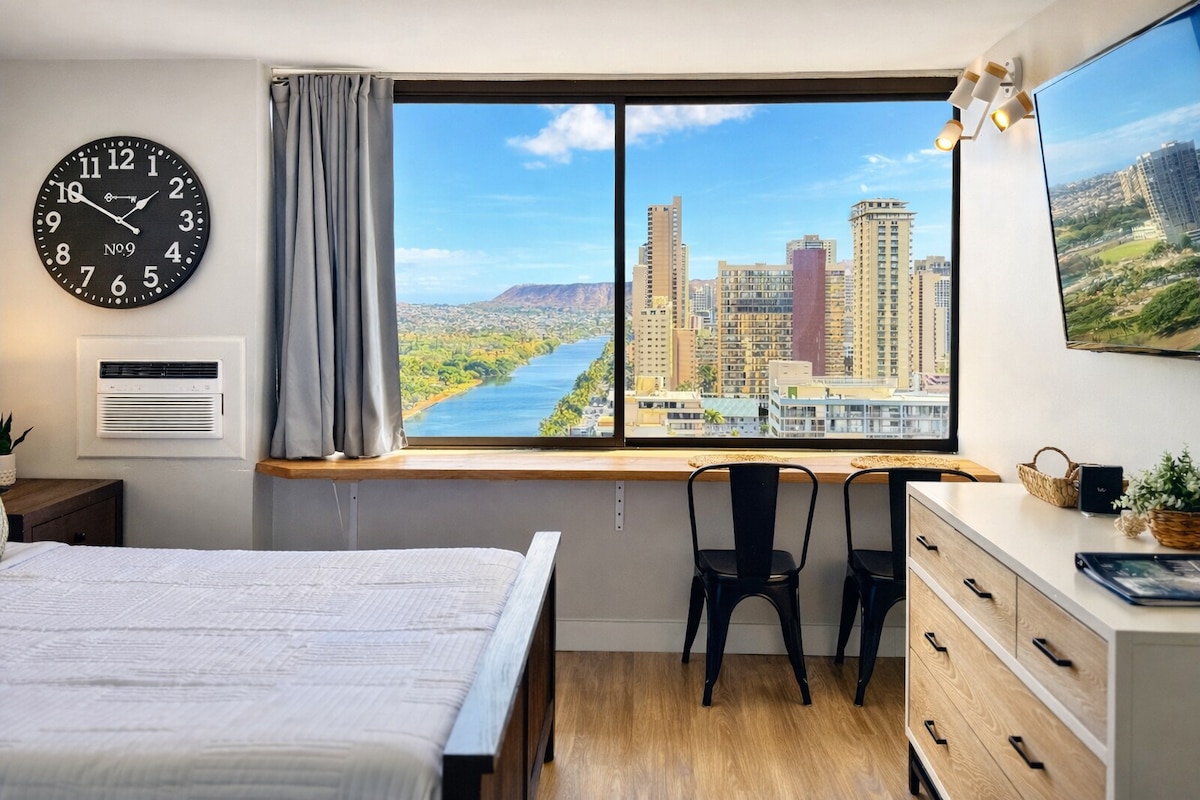 Við upphaf Waikiki, ferðamannamiðstöð Honolúlú. Heillandi stúdíóið okkar í Waikiki er blæbrigðarík eining í Hawaiian Monarch-byggingunni Njóttu stórfenglegs fjallasýnar. Gæðalök, koddar og loftræsting bíða þín. Frábær staðsetning beint á móti ráðstefnumiðstöðinni, í um 10 mínútna göngufjarlægð frá ströndinni og í 15 mínútna göngufjarlægð frá Ala Moana-verslunarmiðstöðinni. Borðaðu, syntu, brimbretti og verslun allt í göngufæri.