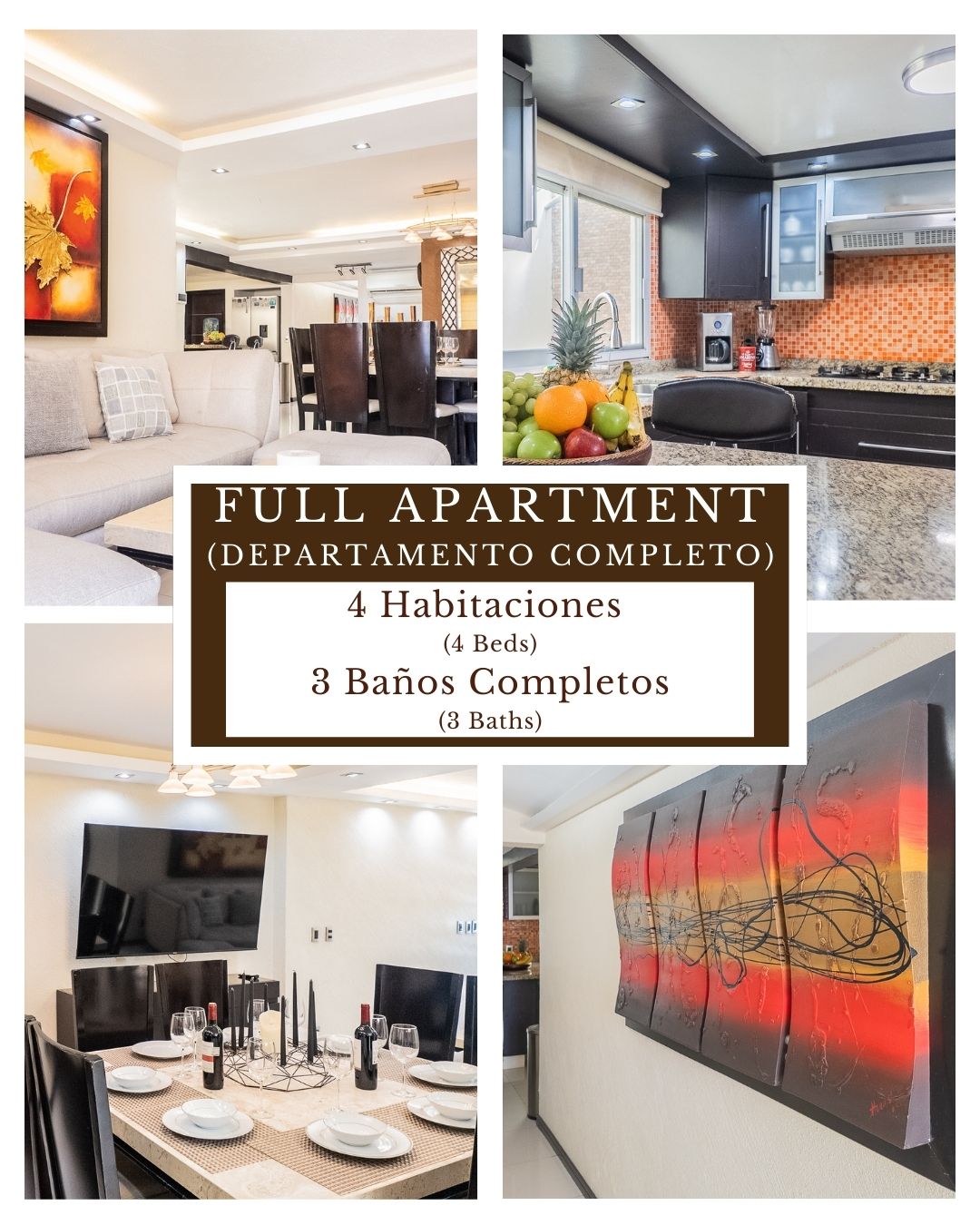 Tveggja svefnherbergja íbúð, borðstofa, borðstofa, eldhús, eldhús, eldhús, bílskúr og tveir bílar. Mjög hrein, hrein rúmföt og handklæði frá 1ra., þægileg og vistvæn, létt og heitt vatn með sólarsellu, varakatli. Frábær staðsetning (Chapalita), nálægt Expo Guadalajara. AAcond fyrir kulda og hita og ÞRÁÐLAUST NET í allri íbúðinni. Samsung 4k sjónvörp allt að 70 tommur , Valkostur 2 í viðbót. Tryggt hreinlæti, gæði og þjónusta. Persónuleg athygli.
