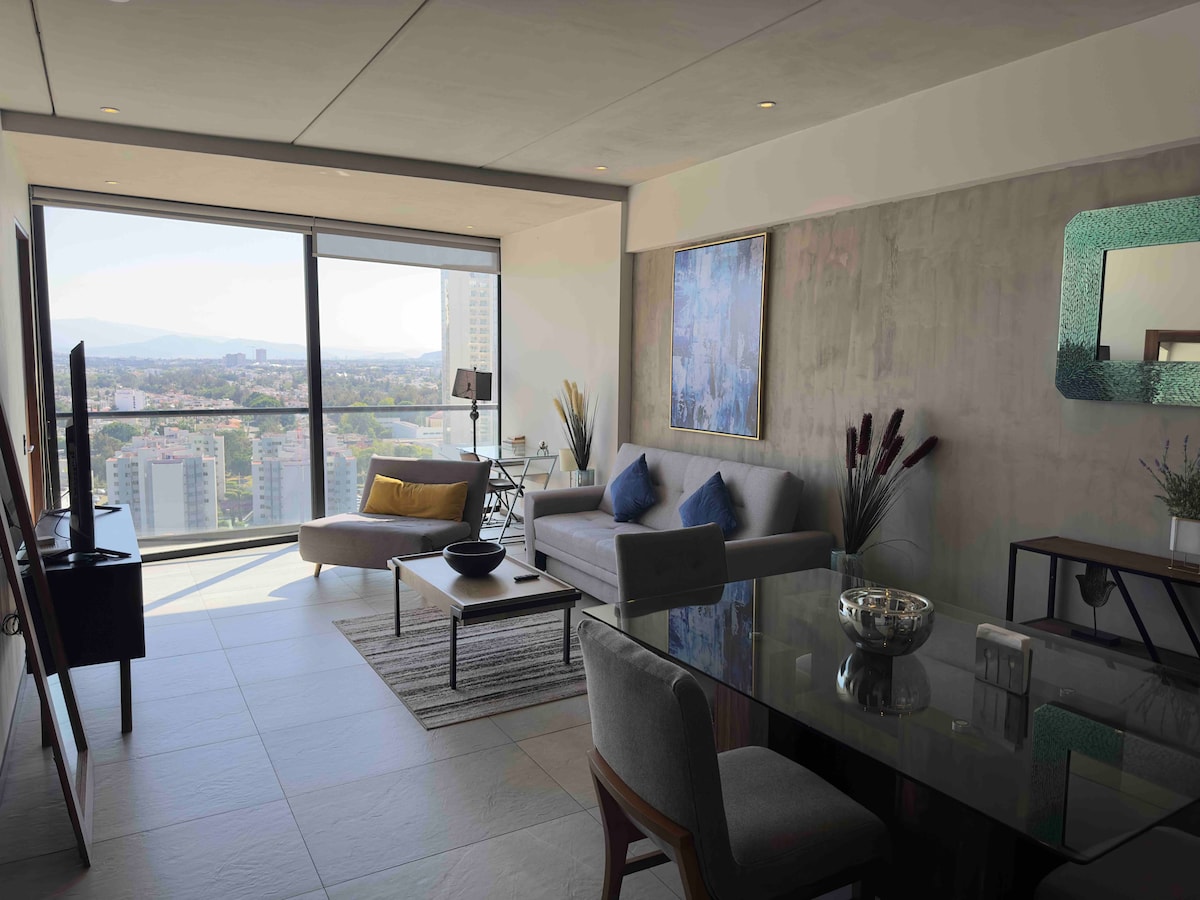Luxurious and beautiful apartment with art deco design and furniture, relax and enjoy of the view because its in a 9th floor, it has amenities such as a scenic pool, gym, panoramic roof top, social room, bbq grills, security and elevators. The apartment has one room with a queen size bed, one full bathroom, laundry room, full kitchen, refrigerator with ice machine and cold water dispenser. We provide 2 towels for shower and 2 towels for the pool. We also offer tours to city and magic towns.