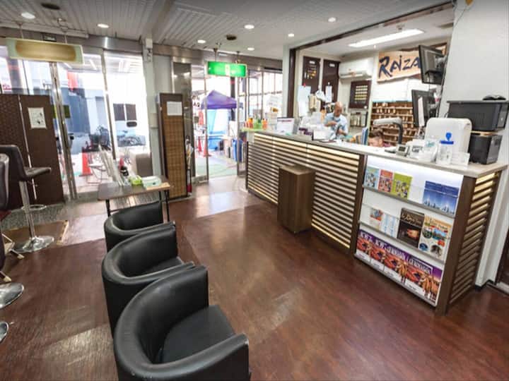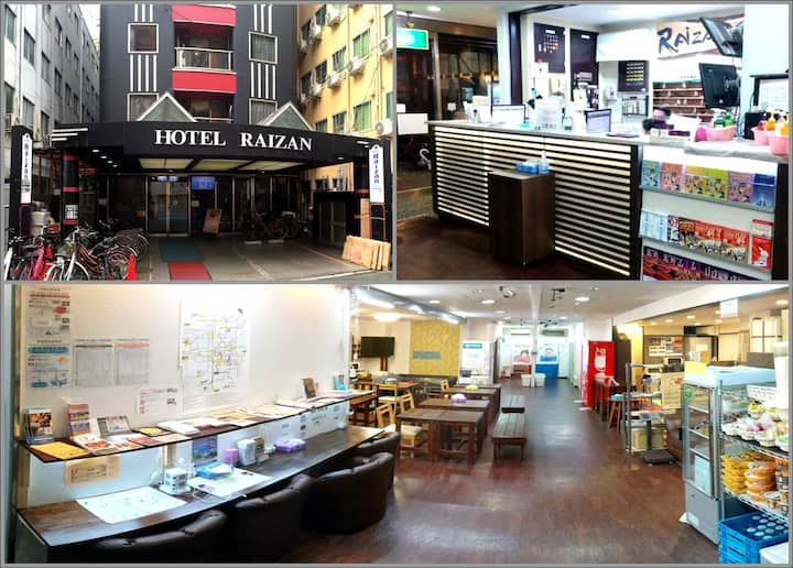 Þetta er hótel Raizan. Það er lægsta farfuglaheimilið aría í Japan.