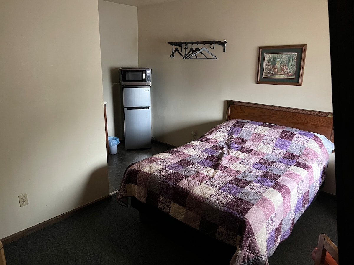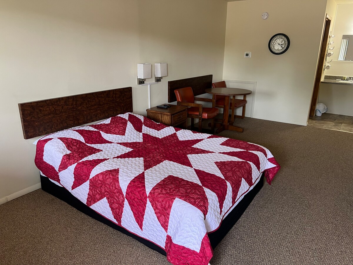 Stígðu inn í nýlega uppfærða herbergið þar sem nútímaþægindi mæta smekklegri hönnun. Þegar þú stígur inn tekur á móti þér rúmgott og notalegt andrúmsloft. Miðpunktur herbergisins er mjúkt rúm í king-stærð sem er skreytt með skörpum rúmfötum og lofar þér góðum nætursvefni. Öll herbergin eru með ókeypis þráðlaust net, sjónvarp, lítinn kæliskáp, örbylgjuofn, eins bolla kaffivél og vistir; allur búnaður, húsgögn og rúm eru glæný árið 2024.