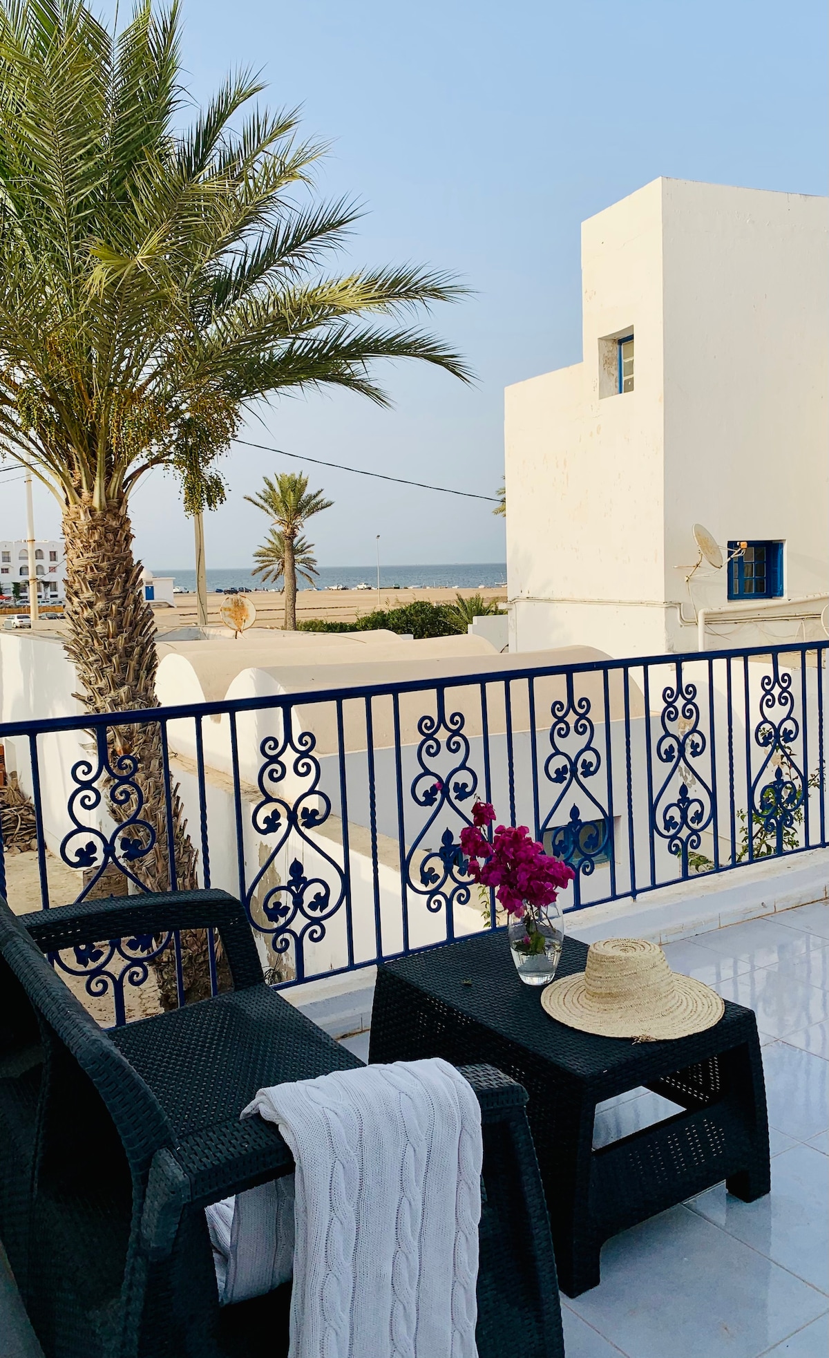 Húsið er staðsett í bænum Houmt-Souk, aðalbæ Djerba. Frábær staðsetning á móti smábátahöfninni, helsta aðdráttarafl borgarinnar, í göngufæri frá hinu fræga souk, verslunum, veitingastöðum og öllu því sem borgin hefur upp á að bjóða. Í húsinu eru 3 tvíbreið svefnherbergi, 1 baðherbergi, eldhús, stofa og borðstofa. + Ungbarnarúm Í húsinu eru einnig 2 sólríkar verandir fyrir framan og aftan húsið. Bæði með fallegu sjávarútsýni.