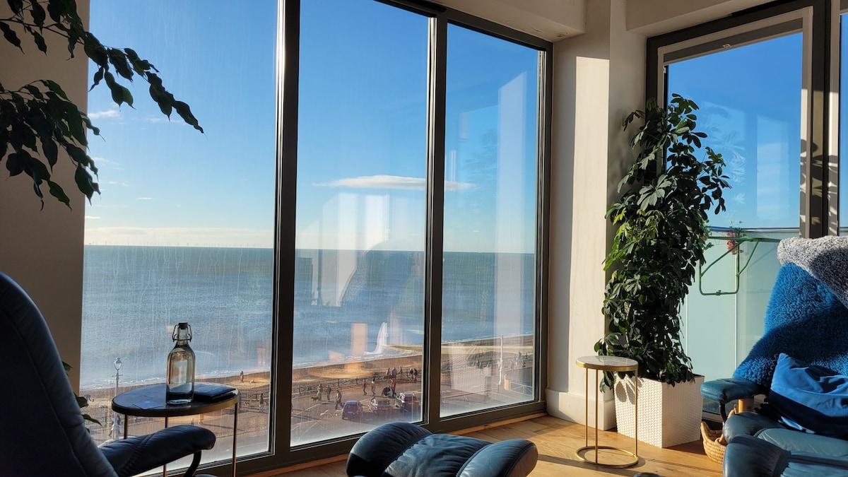 Þvílíkur unaður sem þessi þakíbúð er að bjóða uppá. Stórkostlegt útsýni yfir strönd Brighton & Hove, ströndina og borgarmyndina úr öllum herbergjunum. Sittu í rúminu og þar ertu. Þessi íbúð er friðsæl vin við Kings Road og er tilvalin fyrir mat, drykk, leikhús, strandlíf, verslanir og næturlíf og allt sem borgin hefur að bjóða og allt það sem borgin hefur að bjóða í göngufæri. Einnig gæti verið hægt að fá bílastæði á staðnum á sanngjörnu verði. Óskaðu eftir að bóka. Af hverju að koma til Brighton og ekki sjá sjóinn?