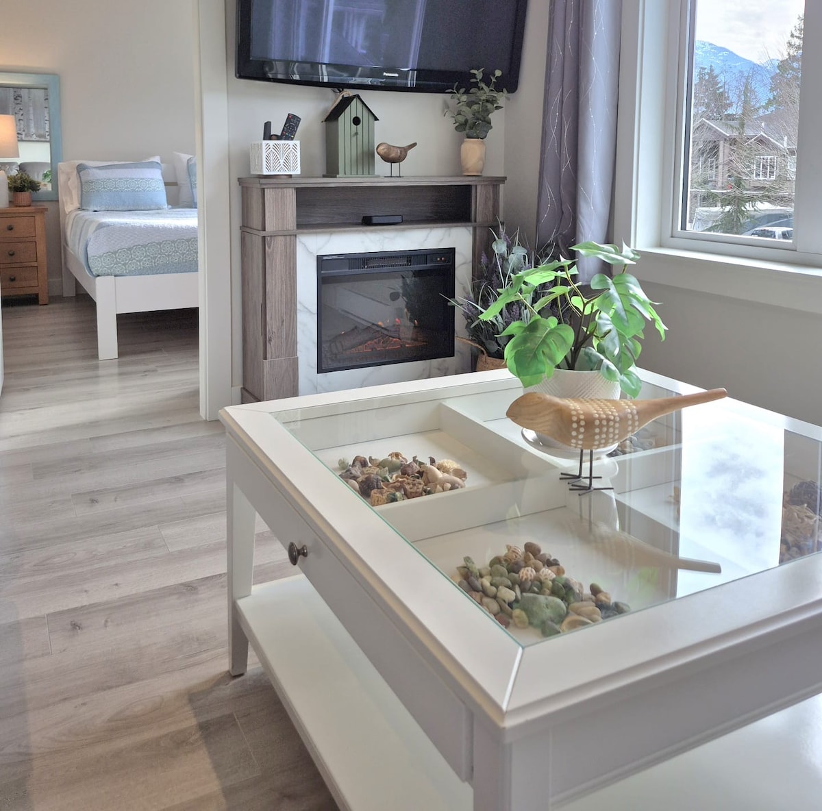This private, open plan suite was created from my former yoga studio within our family home, reusing and repurposing materials wherever possible. Warm reclaimed hardwood floors leads to a deck at the edge of the Princess Park forest, with a salmon creek running to the west. Wildlife often passes through — raccoons, owls, and occasionally even a bear. Some of the North Shore’s best mountain biking is just a block away. A quiet, unique retreat designed for rest, privacy, and nature.