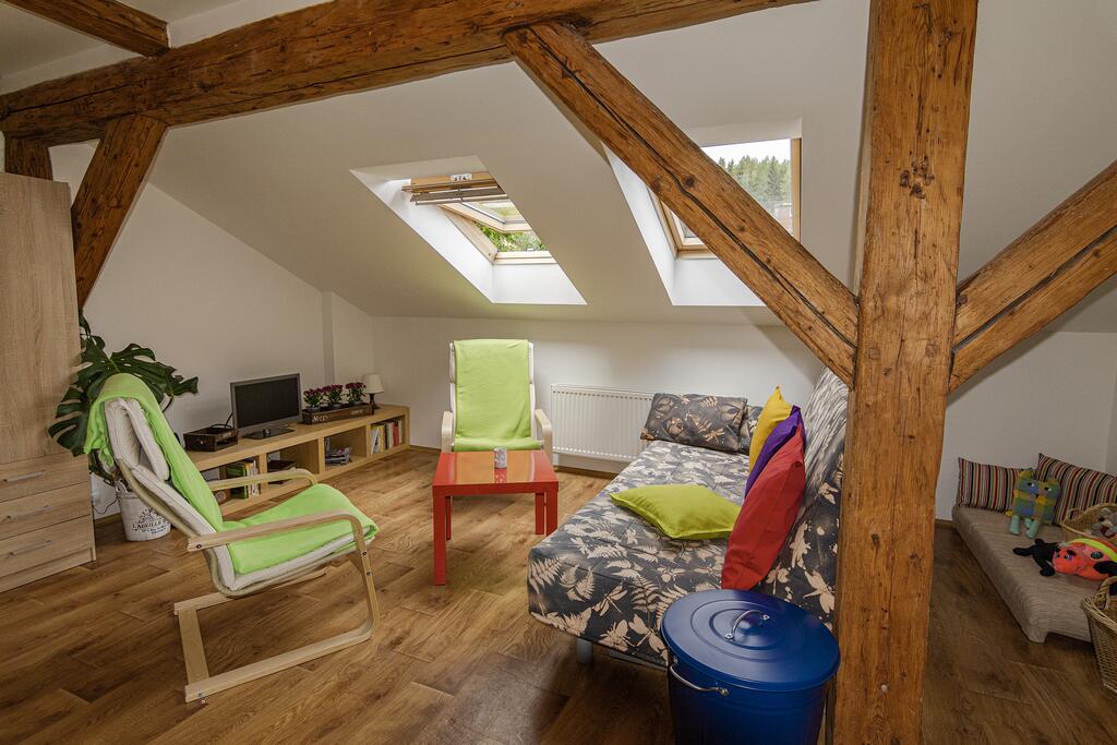 Opna íbúðin okkar á háaloftinu býður upp á einstaka blöndu af þægindum, næði og stemningu sem mun skilja eftir ógleymanlegt áhrif. Þökk sé háu loftinu og sýnilegum bjálkum lítur íbúðin út fyrir að vera rúmgóð og glæsileg. Rúmgóð inni í eigninni er nóg pláss til að slaka á og vinna, sem er tilvalið fyrir pör sem leita að rómantísku afdrep, sem og fyrir fjölskyldur eða einstaklinga. Íbúðin er staðsett á rólegum stað í fallegri Art Nouveau-villu og fallegum garði. Engu að síður er það ekki langt frá mikilvægum áhugaverðum stöðum og þjónustu.