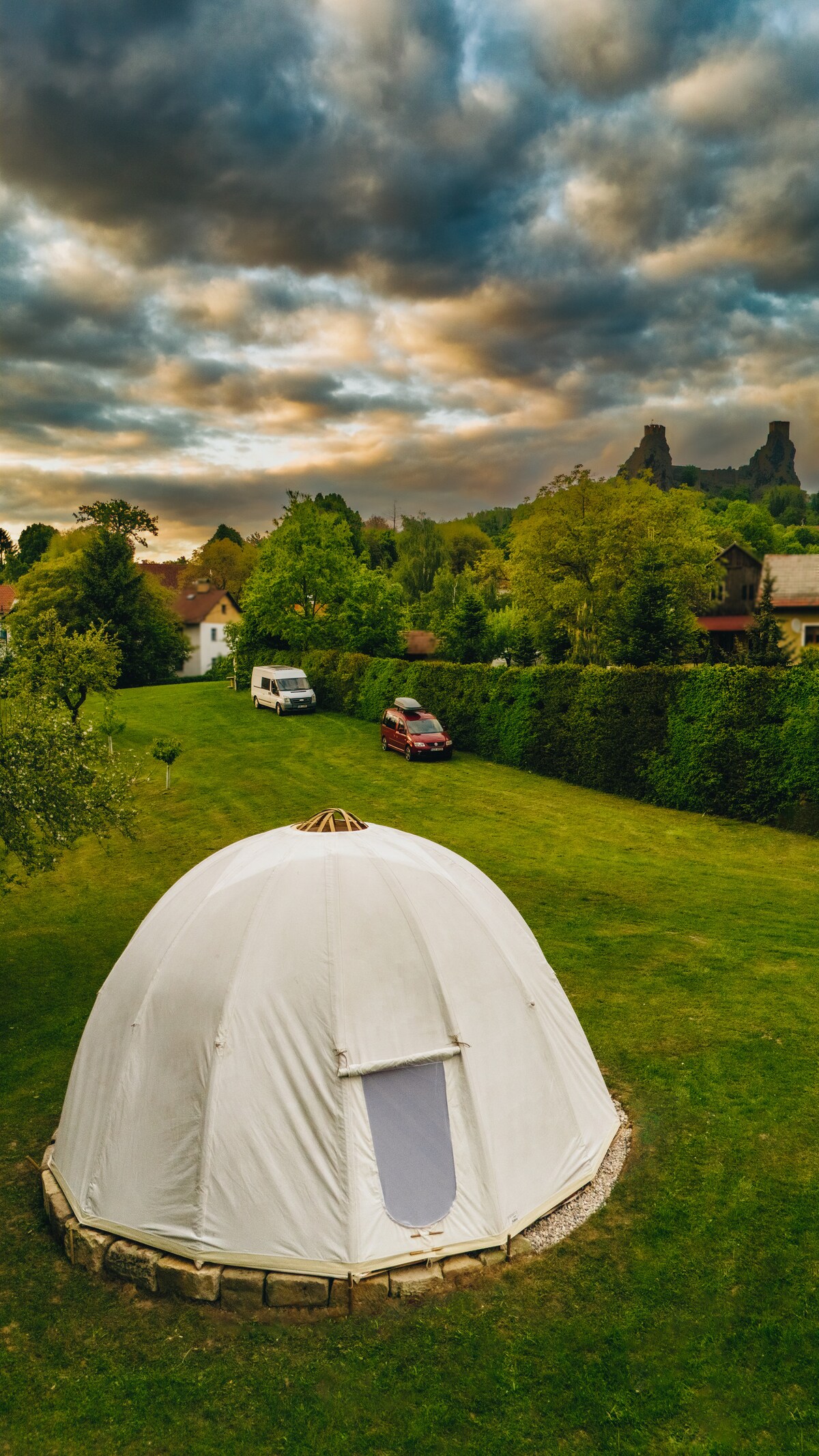Óhefðbundið hvelfingartjald, ekki langt frá mikilfenglegu Trosky-kastalanum, býður upp á upplifunargóða gistingu Lúxusútilegustíll. Inni í rúmi sem er 190x200 fyrir tvo einstaklinga, engin teppi. Ég mæli með því að koma með eigin rúmföt eða svefnpoka. Aukafólk getur sofið á viðarhólfinu. Í tjaldinu er gaseldavél með tekatli fyrir morgunteið. Hitinn inni í Pantheon mun koma frá viðarofni sem þú stjórnar sjálf(ur). Viður er í boði.