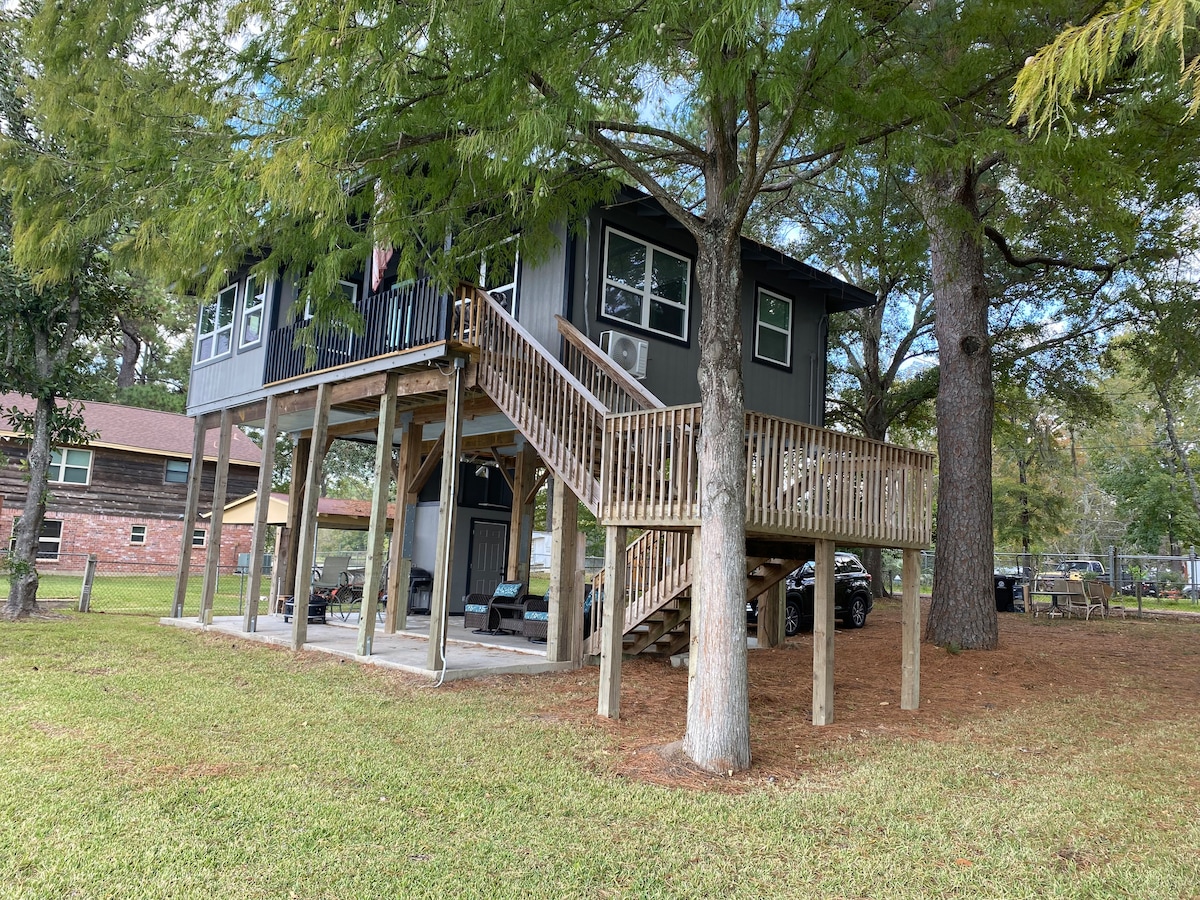 A little piece of Texas paradise w/view of Lake Houston! Cabin accommodations are complete-ready for guests! Peaceful, secluded, un-manicured surrounds w plenty of room to roam. Pets ALLOWED-no leash required. Comfy&well-appointed tiny house design/custom/carpenter built w/cold AC, kitchen, bath/shower, Queen memory foam bed. Firepit, hammock, picnic table. Crosby&Atascosita short drives. UberEats delivers! Lake access, relaxing feel&comfy space!
