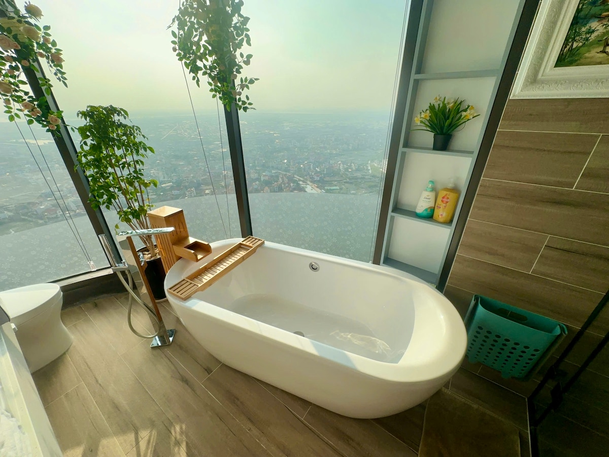 Relax in this cozy yet luxurious Ecopark apartment with ensuite bathtub, private sauna, and a complimentary mini bar. Kitchen includes air fryer, microwave, full kitchen - including cookware and filtered water system, plus washer & dryer. Free gym. The pool, and onsen are accessible with fees await in lush green surroundings. Just 30 mins to Hanoi old quarter with hourly bus service. Monthly guests enjoy extra complimentary perks for even more value.