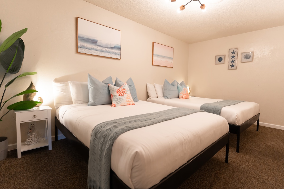 Just steps from the beach, Room #7 offers a tranquil beach-themed retreat. This air-conditioned room features high-speed wireless internet, a flat-screen TV with HD cable, and a refrigerator to keep your drinks cool and fresh. The two queen beds, dressed in ultra-comfortable bedding, provide the ideal space to relax after a day of exploring Orange County’s stunning beaches and attractions.