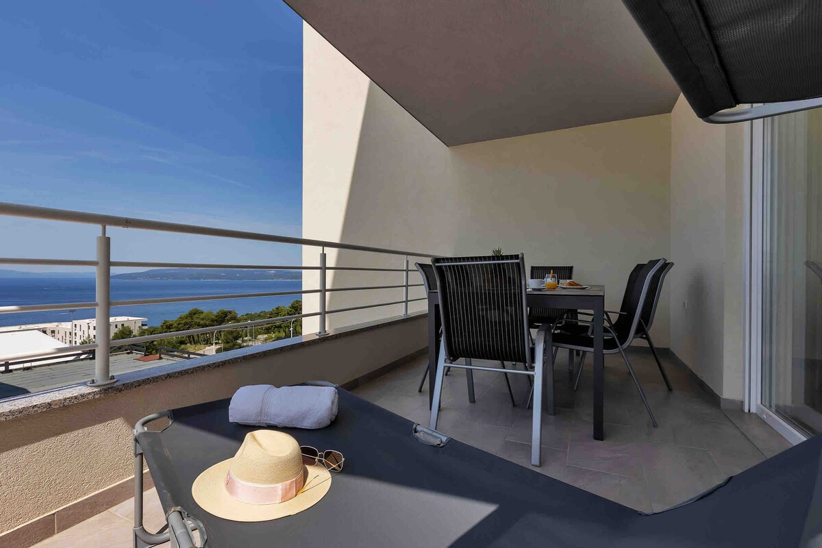 Heillandi íbúðin okkar er staðsett fyrir ofan bæinn Makarska á rólegu svæði upp á við og býður upp á magnaðan sjó. og fjallaútsýni. Gistingin rúmar 4+2 manns í tveimur svefnherbergjum með hjónarúmi og valkvæmum sófa. Eignin er nútímaleg og fullbúin. Þráðlaust net og rúmgóð verönd. Sólbekkir - gistiaðstaða er einnig með loftkælingu. Annað neðanjarðarbílastæði - sé þess óskað