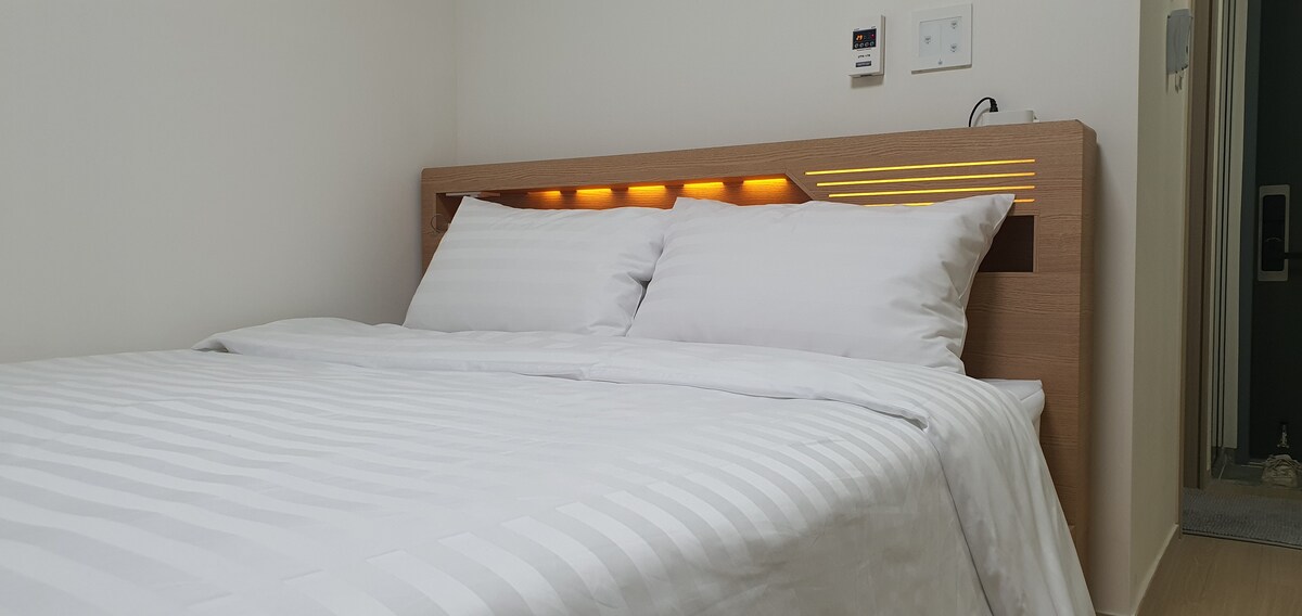 깔끔하고 아늑한 인테리어, 고층과는 다른 중층만의 시야가 꽉찬 환상적인 바다와 모래 해변, 파노라마 파도뷰로 온 마음을 힐링할 수 있는 매력적인 숙소입니다. 🏖🏝🌊 서핑들의 성지 양양 죽도해변, 인구해변과 이어져 있으며 데크길 따라 산책하다보면 양리단길 도착~!🛤 또한 발코니를 통해 동해의 장관, 일출을 숙소에서 감상하세요.🌅🌌 발코니에 등기대고 앉아 커피 한 잔의 여유도 좋답니다. 여기야말로 진정한 커피 맛집👍☕️☕️☕️ 양양 종합여객터미널에서 22분, 강릉 시외버스터미널에서 37분 거리에 위치하고 있습니다. 편안함과 안락함을 선사하는 객실로 더블베드로 구성되어 있습니다. ▶비대면 체크인(숙소의 키패드 번호 입력하여 입실 가능) ▶전문 세탁소에서 고온 살균된 침구 제공 ▶소독제, 살포를 통한 객실 소독, 방역 ▶취사 가능(냄비, 프라이팬 등의 조리도구와 식기제공) ▶넷플릭스(본인 계정으로 로그인하여 시청) ▶메세지 응답 시간 : 오전 09:00~오후 11:00