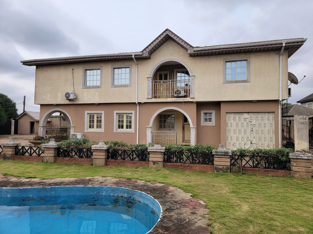 This unique place has its own distinctive style. The standard en-suite room features a semi- orthopedic super king - size comfortable mattress and modern bathroom with water heater. Unlimited super fast 5G Wi-Fi, 43 inches Smart Tv in the room and 55 inches Smart Tv in the sitting room. Netflix, YouTube, DSTV, Smoke alarm, Cctv, 24/7 electricity (Band A) two 50 kva back up generator. Maximum security with security personnel on ground 24/7, 10min to International Airport and Domestic Airports.