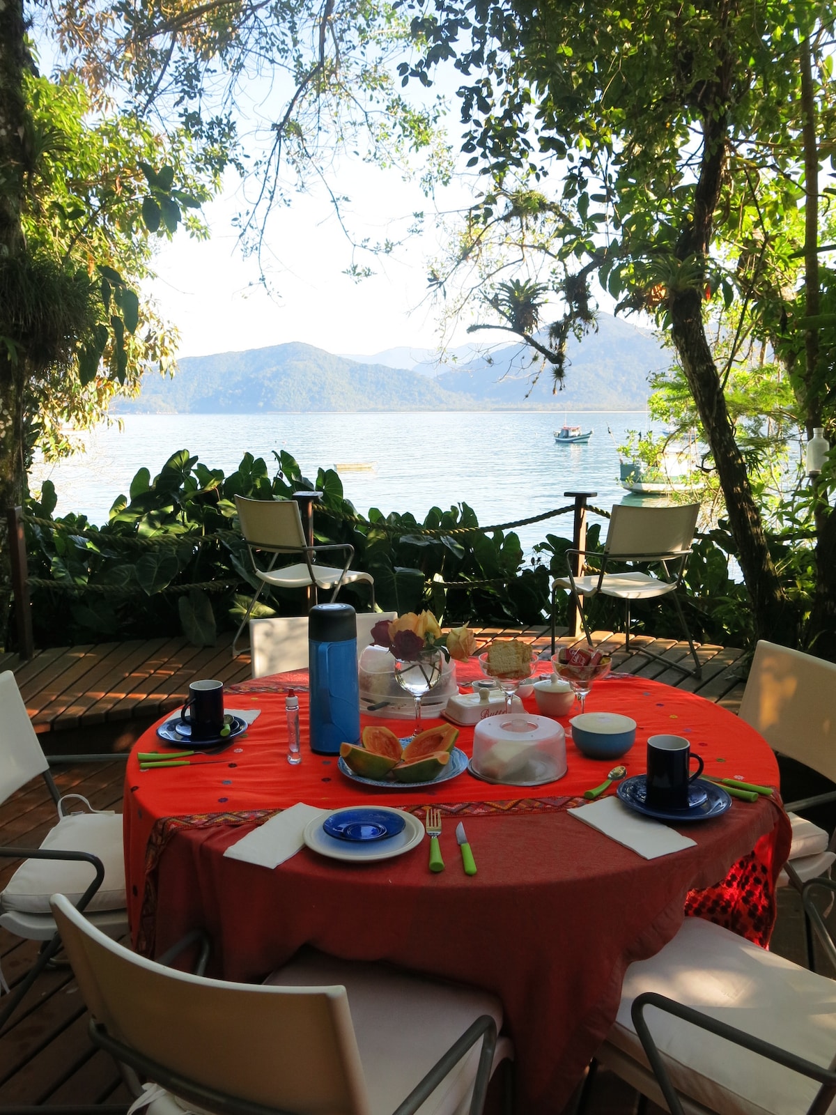 Heimili okkar við ströndina er staðsett á Araújo-eyju og býður upp á friðsæld og þægindi sem eru umkringd gróskumiklum Atlantshafsskóginum. Það er kynnt í tímaritum eins og Bons Fluidos og Architecture and Construction og er með 4 svefnherbergi, sem eru 3 stórar loftkældar svítur, fullkomnar til að slaka á og njóta ótrúlegs útsýnis yfir svæðið. Með innbyggðri stofu og eldhúsi og svölum sem eru fullkomnar fyrir máltíðir eða hvíldarstundir. Við bjóðum upp á kajaka og standandi ásamt skrifstofu með þráðlausu neti