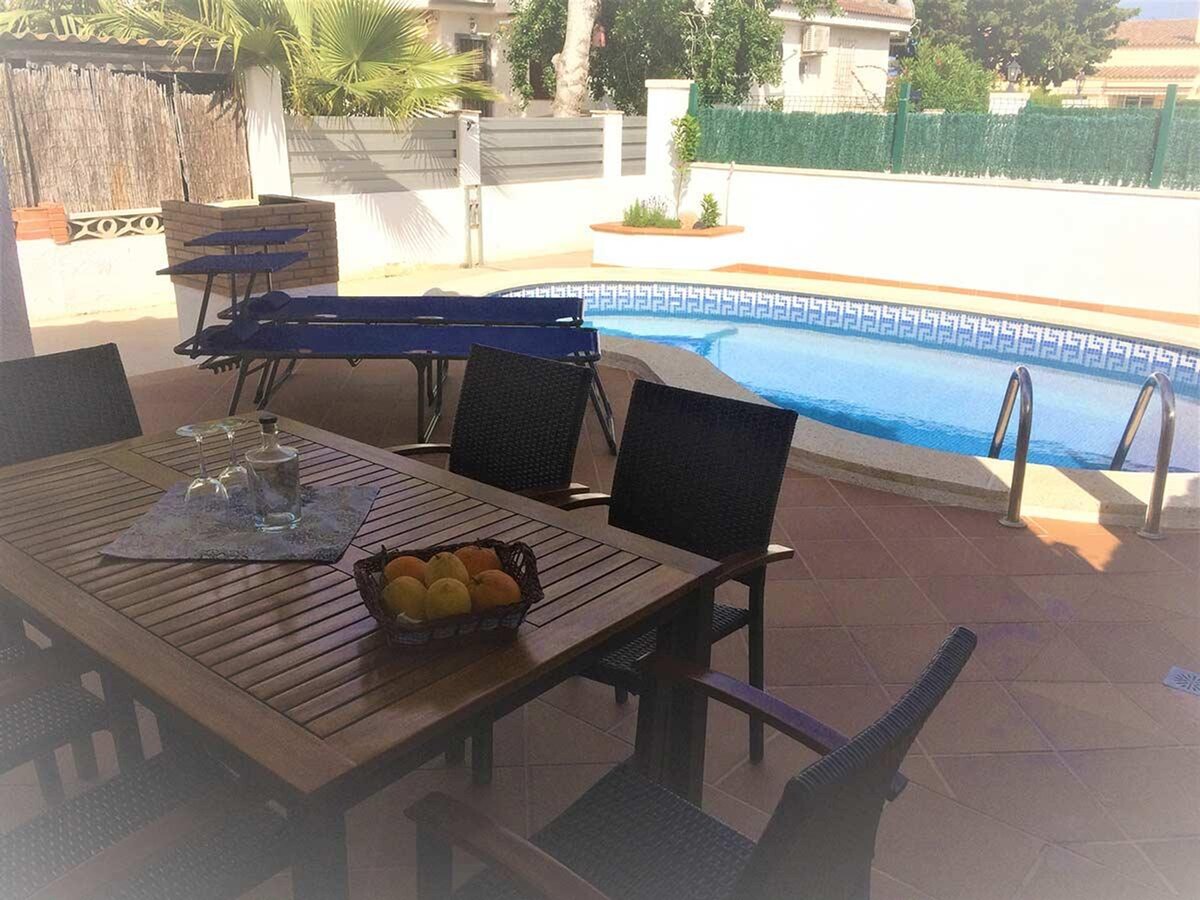 Aðskilin villa með mjög góðri staðsetningu, ný húsgögn, þrjú svefnherbergi, annað tvöfalt og hitt tvöfalt með fataskápum. Stofa og borðstofa sem hafa samskipti við eldhúskrókinn. Fullbúið baðherbergi með baðkari Stór verönd með garðhúsgögnum og efstu verönd. Einkasundlaug með sólstofu, búin húsgögnum og grilli, öll girt, tilvalin fyrir gæludýr og börn. Ókeypis þráðlaust net. Ekkert aukaefni. Sérbílastæði fyrir utan eða í bílskúrnum.
