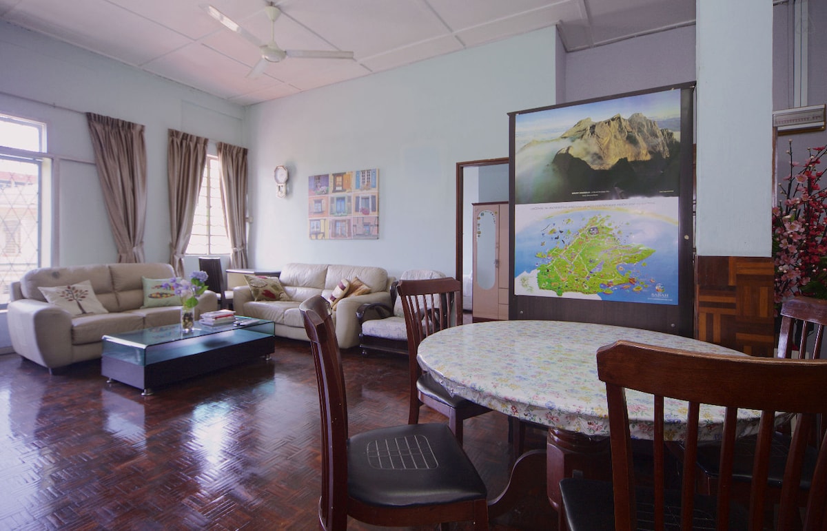 Retro Hideout @ Tanjung Aru Old Town | Sleep 6 with 1 Bath Room | Near Beach & Airport Step back in time and experience the charm of Sabah's heritage in this vintage-style studio located above a traditional shophouse in Tanjung Aru Old Town. Við höfum varðveitt upprunalegu byggingarlistina, allt frá gömlum viðarbjálkum til mynstraðra gólfflísanna, sem veitir þér hlýlega og nostalgíska dvöl með staðbundnu ívafi.