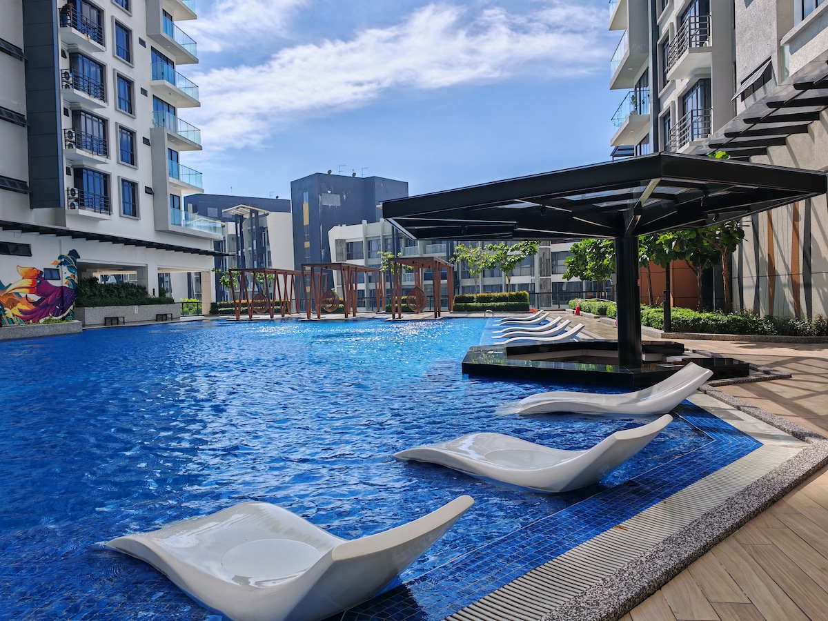 Þetta er fyrsta skráningin mín í Kota Kinabalu. Heimagistingin er staðsett í miðborginni. Hin ríka hönnun og kvikmyndaupplifun er í brennidepli okkar. Með rafrænum hurðarlæsingum, auðveldri og fljótlegri innritun er íbúðin með búnaði eins og sundlaug og líkamsræktarstöð. Það eru margar verslunarmiðstöðvar og matur í nágrenninu, svo þú getur átt skemmtilegt frí með fjölskyldu þinni og vinum. Heimagistingin er staðsett í miðborginni. Hönnunin í rjómastíl og mismunandi kvikmyndaskoðunarupplifun eru aðalatriðin okkar. Það er búið rafrænum hurðarlæsingum til að auðvelda og hraða innritun. Íbúðin er með sundlaug, líkamsræktarstöð og annan búnað. Það eru margar verslunarmiðstöðvar og veitingastaðir í nágrenninu. Njóttu frísins með fjölskyldu og vinum.