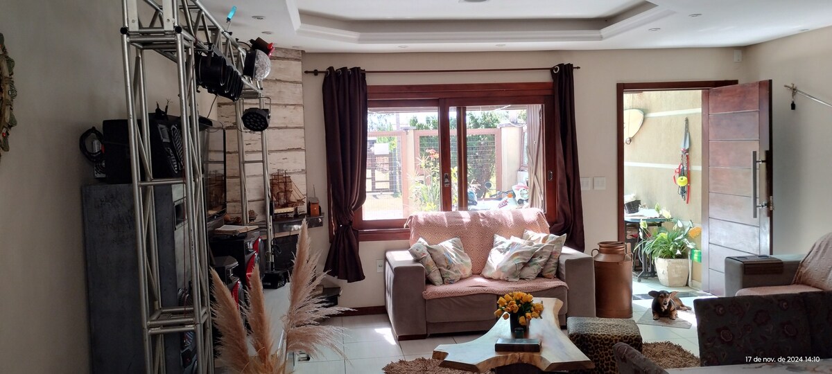 Sobrado em condomínio fechado na beira do rio em Imbé. A casa possui dois andares, sendo que no térreo ficam área de convivência com ambientes integrados de sala de estar com TV a cabo, lavabo, sala de jantar, cozinha completa com 2 mesas para refeições e mesa de sinuca. Parte externa com duas varandas, móveis rede, mesa de jantar, churrasqueira e piscina privativa medindo 6.00 x 3.00m. Andar superior tem 1 suíte, mais 2 dormitórios e um banheiro. Todos os quartos tem ar condicionado.