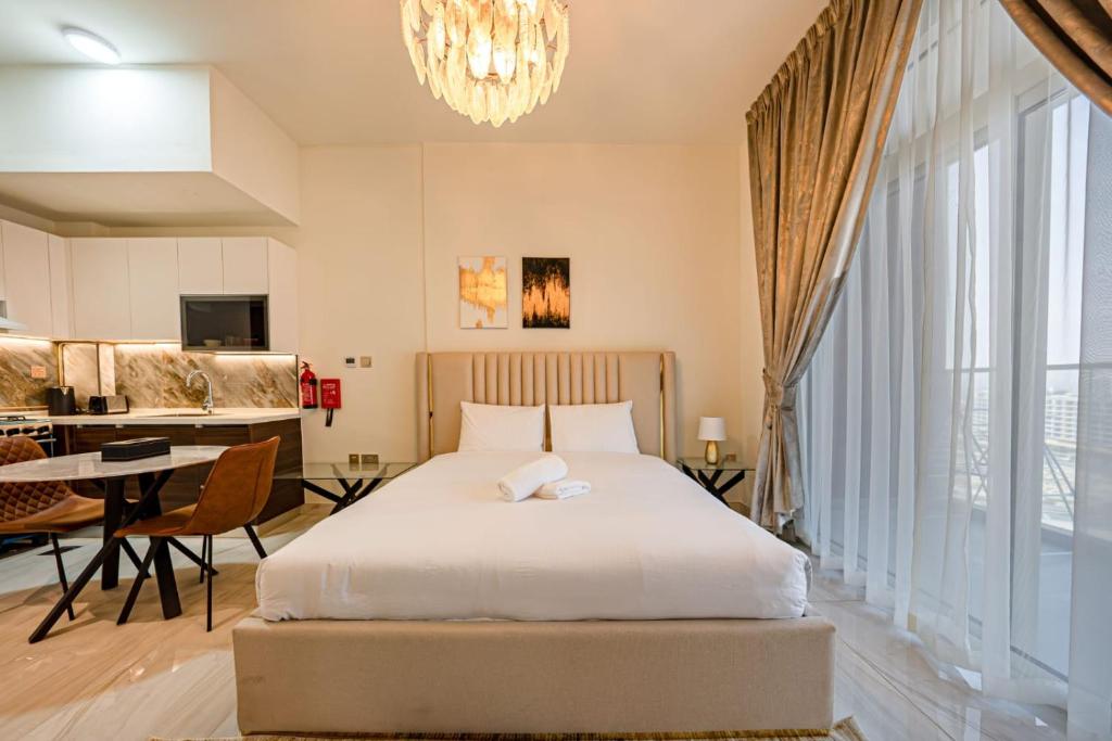 Upplifðu nútímalegt líf í flotta stúdíóinu okkar í MAG City, nýþróuðu verkefni eftir MAG. Íbúðin er úthugsuð fyrir þægindi og býður upp á andrúmsloft eins og hótel með úrvalsþægindum. Í friðsælu umhverfi nýtur þú friðsællar dvalar í stuttri akstursfjarlægð frá verslunarmiðstöðinni The Dubai Mall og öðrum áhugaverðum stöðum. Hvort sem þú ert hér í stuttri heimsókn eða lengri dvöl býður stúdíóið okkar upp á fullkomna blöndu af lúxus og þægindum í hjarta Dúbaí.