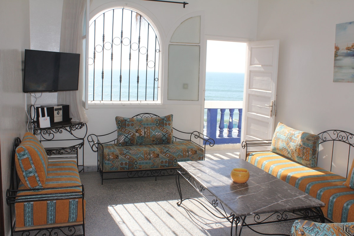 Þetta er eina íbúðin með 17 m2 svalir sem eru byggðar fyrir ofan stíginn sem liggur meðfram ströndinni og býður upp á einstakt útsýni yfir öldurnar, þorpið, fiskimenn og brimbrettafólk. Mjög þægilegt, innréttað og vandlega viðhaldið fyrir framúrskarandi dvöl yfir sjónum, nálægt mörgum kaffihúsum og veitingastöðum meðfram ströndinni og 2 skrefum frá brimbrettaskólunum, í hjarta þessa vinalega Berber-þorps þar sem blandað er saman fiskimönnum, verslunum, brimbrettafólki frá öllum heimshornum...og nokkrum ferðamönnum.