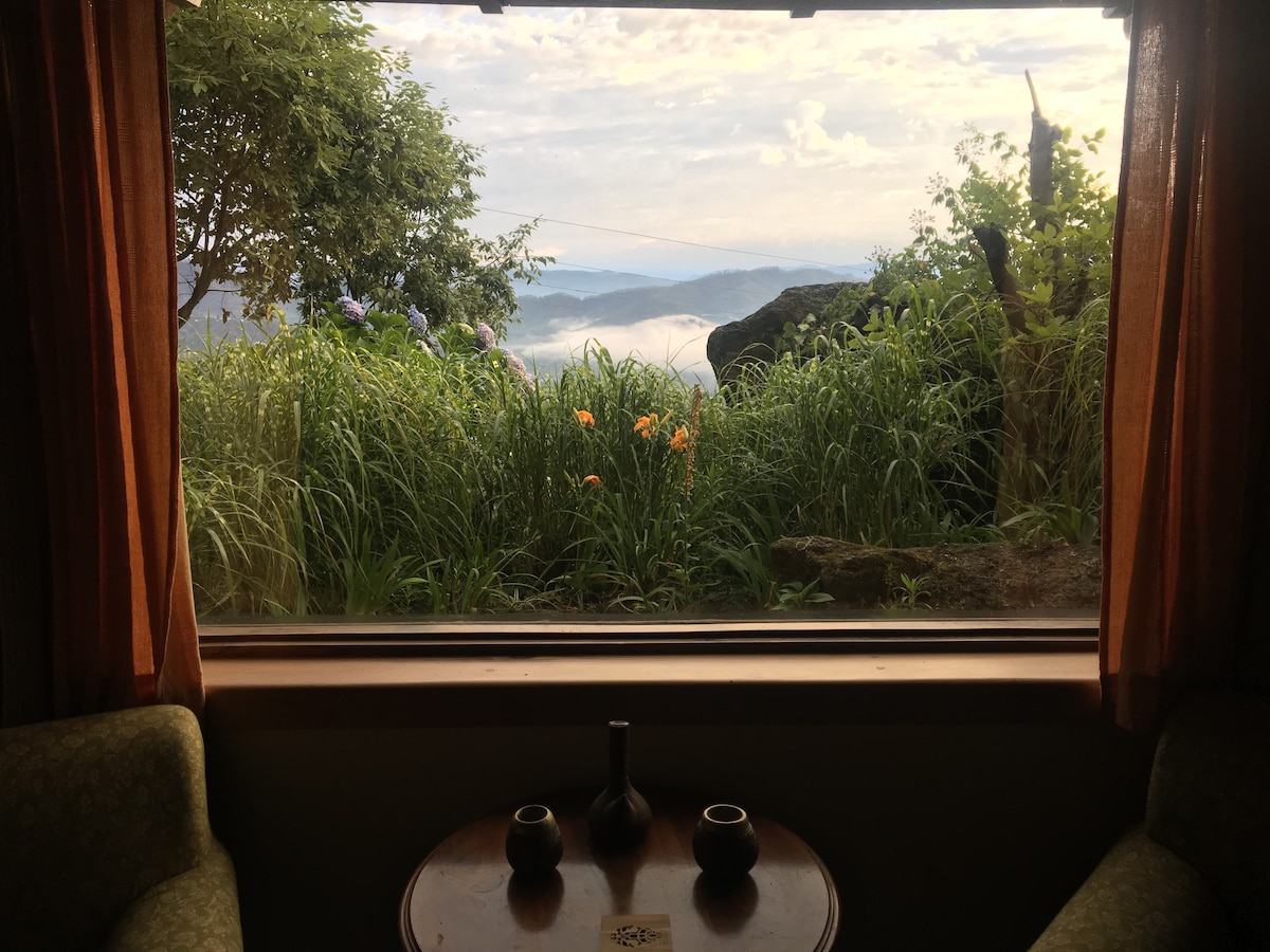 Fyrir 2 fullorðna og tvö börn. Tveggja hæða, A shaped Glass- Wood- And- Stone studio villa innan um Avocado tjaldhiminn og lítinn Kiwi vínekru og nokkrar sjaldgæfar blómplöntur í forsendu forfeðraeignar okkar. Vinatge-stilling, arinn, ferskvatnslind, margar tjarnir, hengirúm og stöðug kvika fugla til að veita þér félagsskap. Tilvalið fyrir göngufólk, lesendur, fuglaáhugafólk, náttúruunnendur, hugleiðsluiðkendur eða fólk sem er að leita sér að rólegum stað í skógi.
