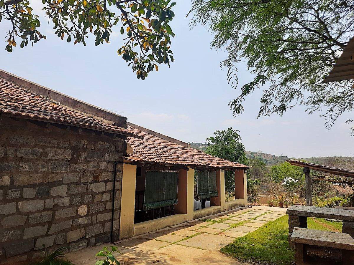 HORFÐU Á HÆÐINA OG STJÖRNURNAR! Verið velkomin í „Taare“, bústað við Anemane-býlið. Slappaðu af í afdrepi okkar í útjaðri Bangalore sem liggur að Bannerghatta-þjóðgarðinum. Upplifðu notalegt sveitalegt rými, láttu kalla fugla og sökktu þér í dýralífið; fylgdu náttúruslóðum eða lærðu smá um endurbyggingu og eldamennsku á viðareldavél, fullkomnu afdrepi frá klukkunni og óreiðu í borginni. Ef borgarlífið er í stuttri akstursfjarlægð eru lífleg kaffihús og verslunarmiðstöðvar í stuttri akstursfjarlægð.