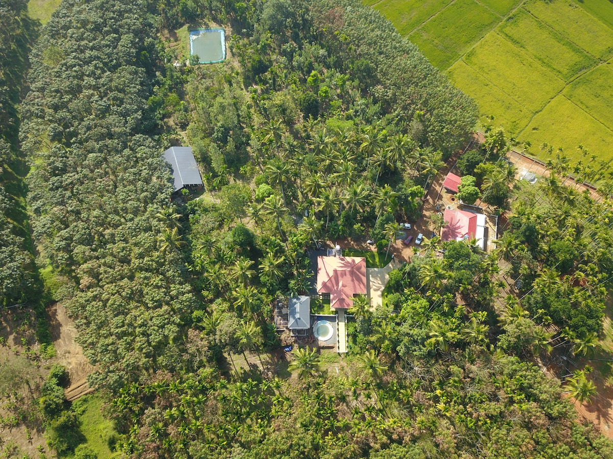 Farmville er falin inni í einnar hektara kaffiplantekru í Wayanad og er notaleg tveggja svefnherbergja villa við árstíðabundinn foss og tegarða. Njóttu fjallaloftsins, röltu um laufskrúðuga slóða og kældu þig í náttúrulegu, klórlausu setlauginni okkar. Eignin er full af pipar, kardimommum, engifer og litríkum blómum. Hún er fullkomin fyrir letilega morgna, kyrrlátt sólsetur og náttúruunnendur sem vilja slaka á og njóta kyrrðarinnar.