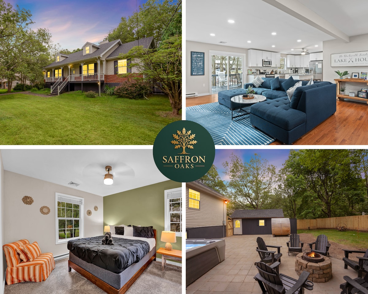 Falið í Pocono-fjöllunum nýuppgerð, nútímaleg, rúmgóð og fjölskylduvæn skála í samfélagi með öllum þægindum Einkagistingu 3000sqft 4bed3bath flýja hvíla á 1.5acres með ótrufluðu útsýni í verndað skóglendi varðveita Njóttu gufubadsins, nýja heita pottins, leikherbergisins, arineldsins, eldstæðisins Samfélagið býður upp á 5 stöðuvötn, 3 strendur, fiskistöðuvatn, 2 laugar, leikvanga, tennis- og körfuboltavelli Augnablik frá fuglaskoðun, gönguferðum, víngerðum, skíði, vatnsgörðum innandyra, golfi og spilavítum