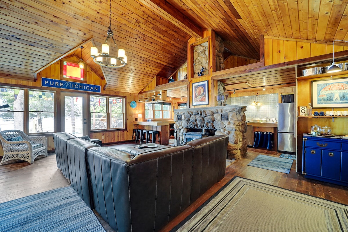 Elkhorn Log Cabin, sem staðsett er í fallega bænum Wolverine, Michigan, hefur gengið í gegnum vandlega endurreisn til að skapa andrúmsloft hlýju og sjarma. Endurreisnarferlið fól í sér vandaða notkun á staðbundnum, endurheimtum skógum og efnum sem leiðir til sveitalegs en fágaðs andrúmslofts. Staðbundnu gluggarnir bjóða upp á töfrandi útsýni yfir skóginn í kring og hvetja til náttúrulegs loftflæðis. Að mínu mati eru ekki margir staðir sem fara fram úr þessari friðsæla staðsetningu.