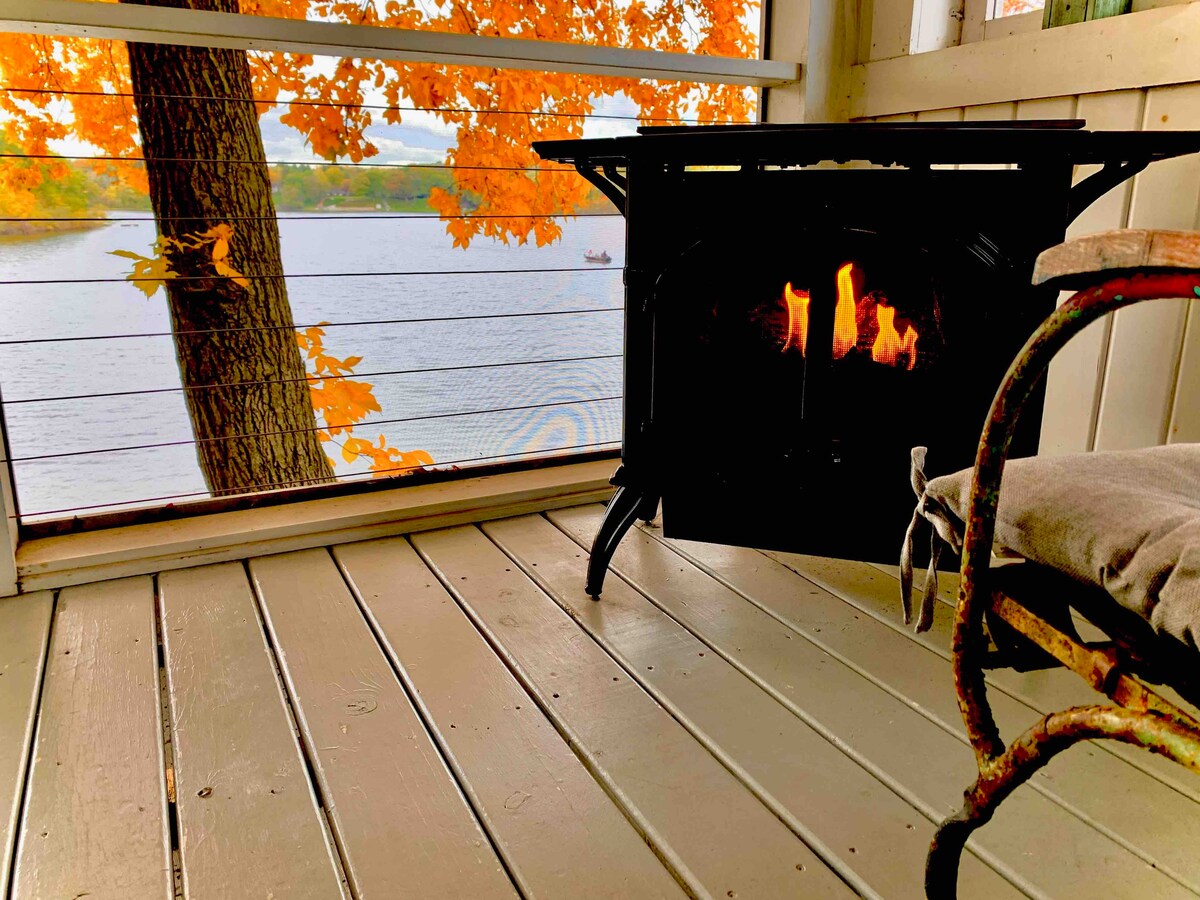 Verið velkomin í friðsæla flótta ykkar! Njóttu sjarmans í afdrepi bústaðarins okkar með mögnuðu útsýni yfir vatnið. Slakaðu á á rúmgóðri veröndinni sem er sýnd og njóttu útivistar án leiðinlegra pöddna. Notalega svefnherbergið, borðstofan og stofan eru öll með mögnuðu útsýni yfir stöðuvatn. Dekraðu við þig á baðherberginu með íburðarmiklu baðkeri og gufusturtuklefa. Eldhúsið, með nýjum tækjum, gerir eldamennskuna gola. Stígðu út á veröndina úr stofunni og njóttu kyrrðarinnar í umhverfinu.